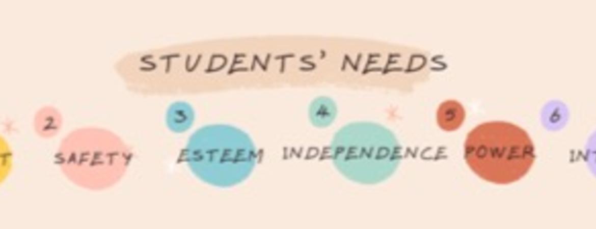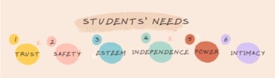 [Image Description: A graphic titles Students' Needs with the following six needs listed: trust, safety, esteem, independence, power, intimacy.]