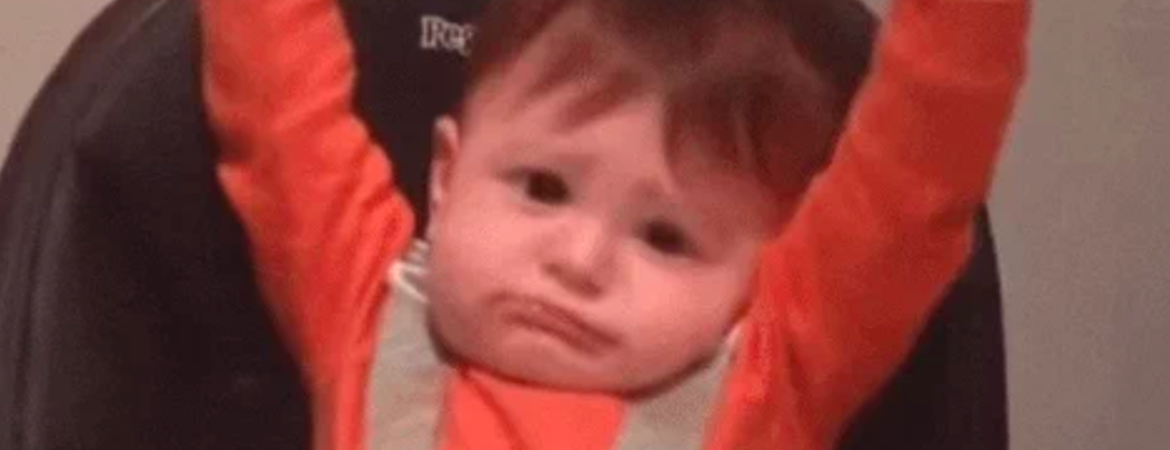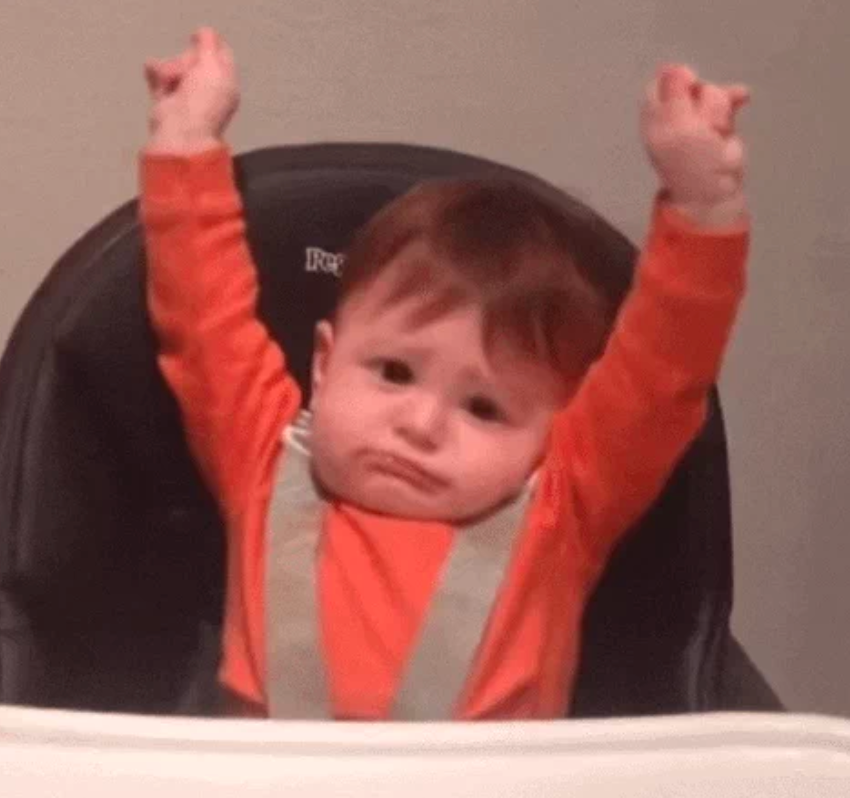 [Image Description: A seated baby strapped into his high-chair stretches both arms up.]