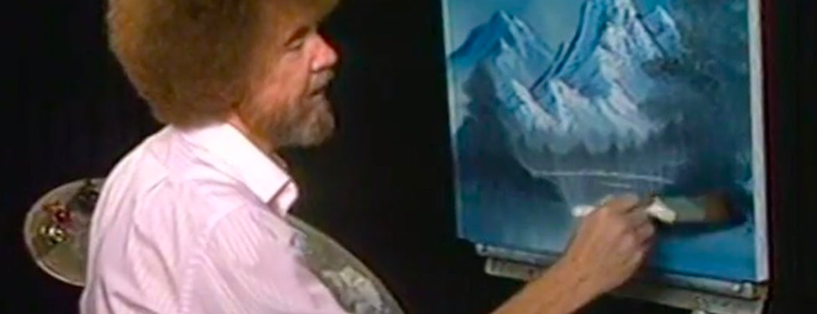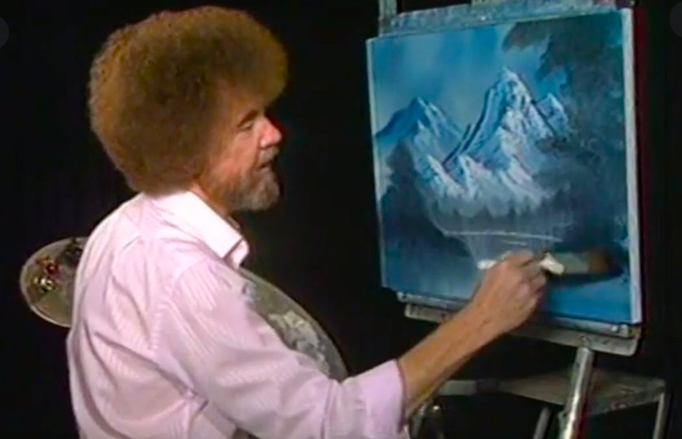 [Image Description: Bob Ross mixing colors on his palette, using a thick brush. He’s painting a sky view with lots of clouds.]