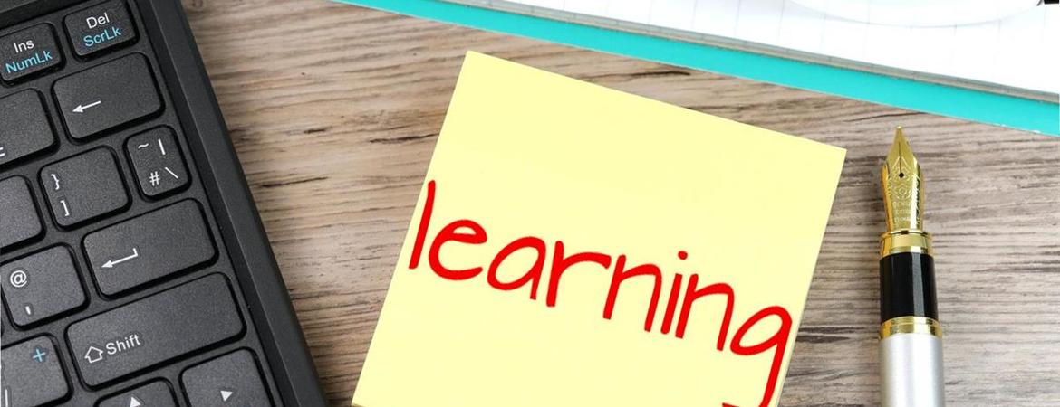 [Image Description: A pencil, apple, notebook, and microscope sit on a desk. Upon the notebook sits a small dog performing paw extensions. The background is endowed with the text: “Learning: Cool at Home or School!”]