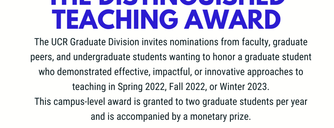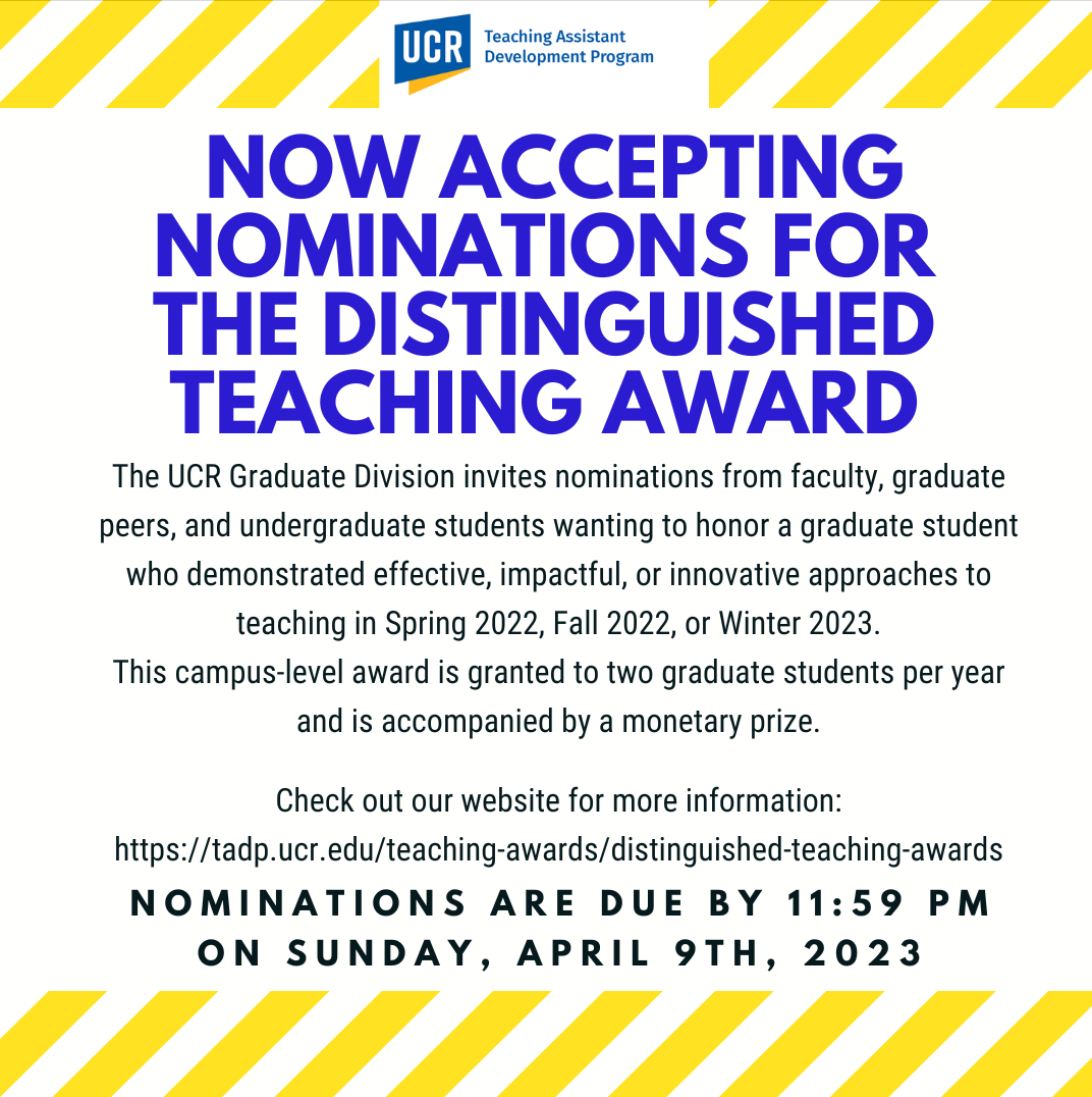 Submit your nominations by 11:59 PM on Sunday, April 9, 2023! As the flyer states, nominations are welcome from faculty, graduate student peers, and undergraduate students. You can nominate yourself for this award, but self-nominations must be supplemented by additional nominations. An important disclaimer: “Nominees must have been enrolled graduate students that held a teaching assistant or associate-in position during Spring 2022, Fall 2022, and/or Winter 2023 Quarter(s). Summer term appointments are not eligible for consideration for this award” (TADP website). Please visit the TADP website for additional information and instructions before filling out the nomination form.