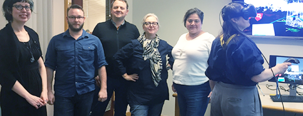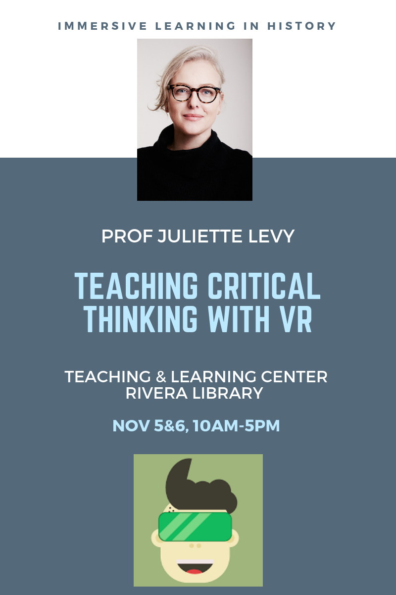 UC Riverside’s Associate Professor of History Juliette Levy likes to teach from the edge of the e-learning revolution. Her latest experiment involved a virtual reality (VR) platform intended to stimulate intellectual learning on an emotional level for the students in her History 20 / World History course. Dr. Levy co-created a VR application called “Che’s Village” and invited students and faculty to test and review the platform in Orbach Science Library on February 15 and 16. “We serve a population of students who are digitally savvy,” Dr. Levy explained. “We have an amazing student body and an amazing faculty, and we need to teach them to think critically using the tools in their environment.” Gesturing toward the wall, where a large monitor displayed what the student in the virtual reality goggles was seeing at that moment, Dr. Levy added, “This is the future of public education in here. Technology is a means to activate and render moments of the learning experience more intense.” The platform was built to amplify students' experience of studying Che Guevara's speech, "Social Ideals of the Rebel Army," which he delivered to a live audience on January 27, 1959 and was subsequently broadcast over the radio. Guevara along with Raul Castro and others had recently won the rebellion against the existing Batista regime in Cuba, Levy explained. In his speech, Guevara had to balance the nationalistic, pro-Cuba intent of Castro with Guevara's own intent to lead a communist revolution. The application’s co-creator and head of a VR prototype studio named Shovels and Whiskey, Tawny Schlieski stated, “We built this VR environment for students who have read Che’s speech. It’s meant to provoke them into compelling questions, to connect pieces of text with other pieces of research.” Once inside the virtual world, exactly as Schlieski had explained, the user could see the text of