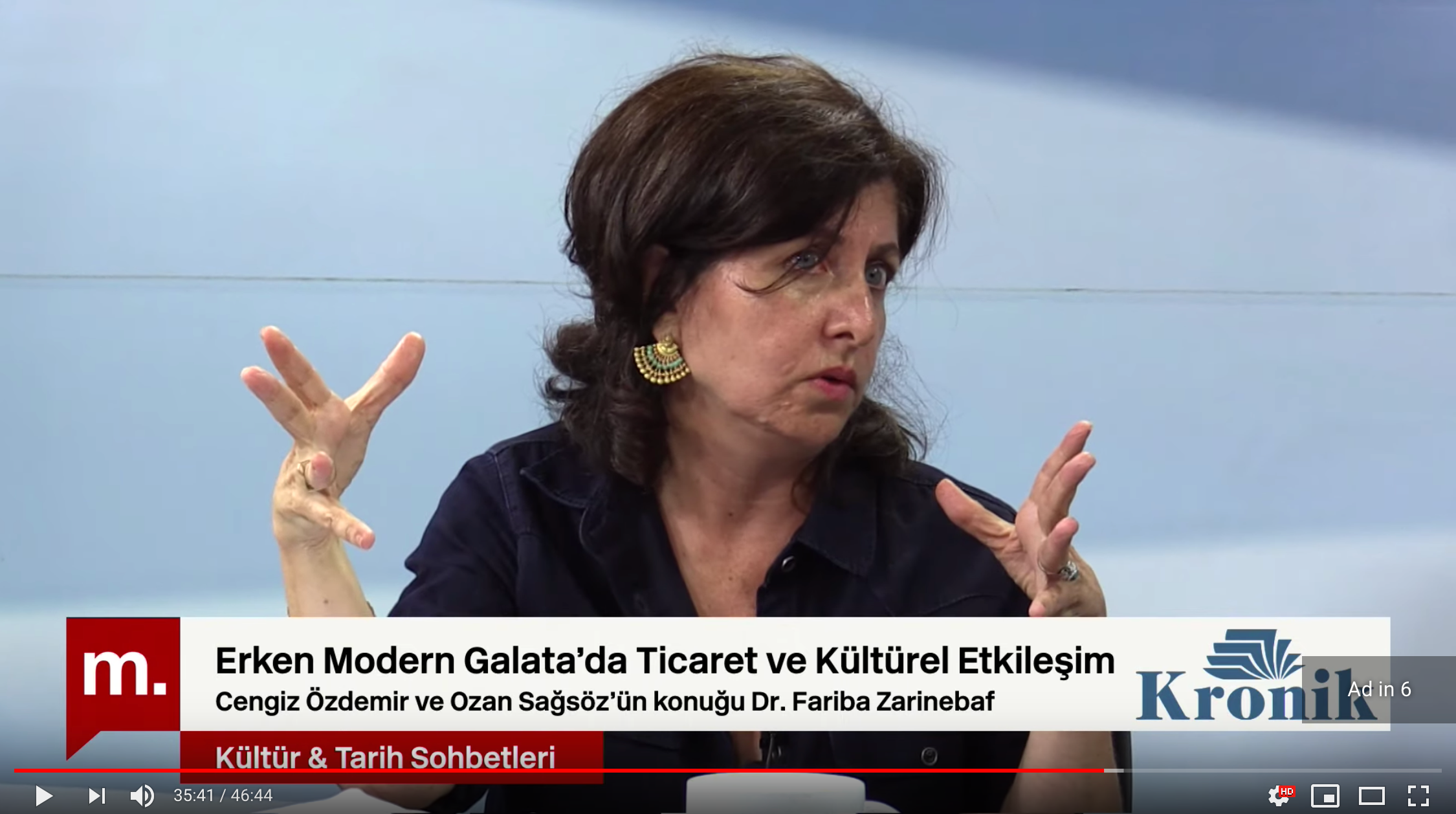 Medyascope is an independent program devoted to debates and discussion with leading scholars of their contributions to the history of the Ottoman Empire. It is the most watched program on History & Culture (live) in Turkey with 145 episodes (weekly). Zarinebaf was their first foreign guest, and they interviewed her on her two books. The first is on Istanbul (Crime and Punishment in Istanbul, 1700-1800 UC Press, 2011) and the second is on Galata (Mediterranean Encounters: Trade and Pluralism in Early Modern Galata, UC Press, 2018). Zarinebaf also discussed her next book project on the Silk Road: From Persia to the Ottoman Empire and Europe in the Early Modern Period.