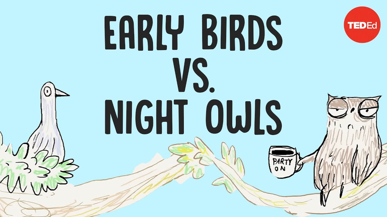 Caption: An illustration of the opening slide of a Youtube video depicting a bird and an owl holding a coffee cup sitting on two connecting branches of a trees appearing to be having a discussion. The title of the video is superimposed over the illustration - Early Birds vs. Night Owls.