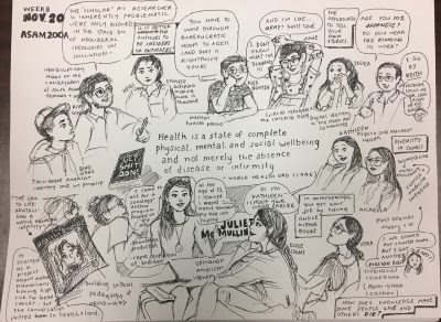 For me, it is important that each student has the opportunity to listen to, share, and/or be heard in ways that resonate for each of them. Pedagogically, I’ve tried to scaffold different approaches that attune to the plurality of students in the space— for instance, through reserved time for journaling and/or flash drawing in class; virtual jam and collage boards; live reading and annotation; collaborative writing through shared Google documents; larger discussions and smaller group work; and tailored exercises with a peer. On Zoom, this has translated into mobilizing the small breakout room function, scheduling one-to-one meetings with students, creating structured time for students to journal and/or draw via critical prompts, using accessible platforms like Padlet to create virtual exhibits, and creating pockets of time for students to discuss questions on their own (I temporarily “leave” the Zoom space).
