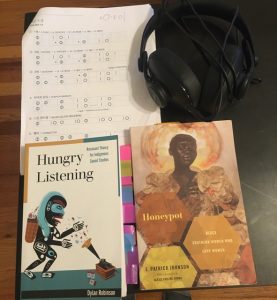 Headphones, 풍물 (poongmul) music sheet, and two books for research (E. Patrick Johnson’s Honeypot: Black Southern Women Who Love Women and Dylan Robinson’s Hungry Listening: Resonant Theory for Indigenous Sound Studies).