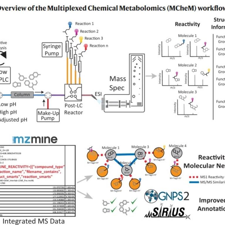 Metabolite identification in non-targeted mass spectrometry-based metabolomics remains a major challenge due to limited spectral library coverage and difficulties in predicting metabolite fragmentation patterns. Here, we introduce Multiplexed Chemical Metabolomics (MCheM), which employs orthogonal post-column derivatization reactions integrated into a unified mass spectrometry data framework. MCheM generates orthogonal structural information that substantially improves metabolite annotation...