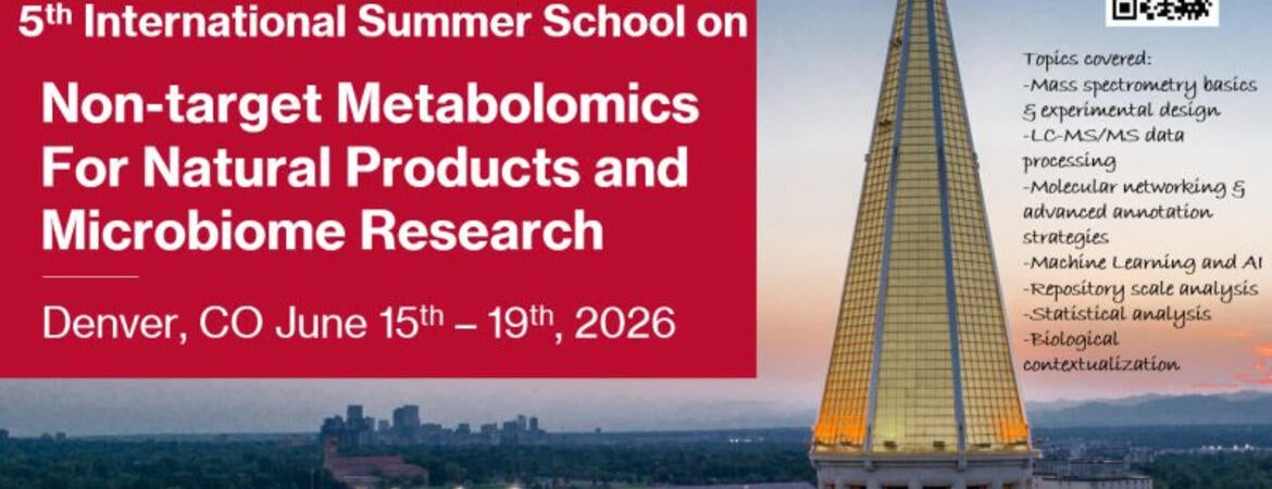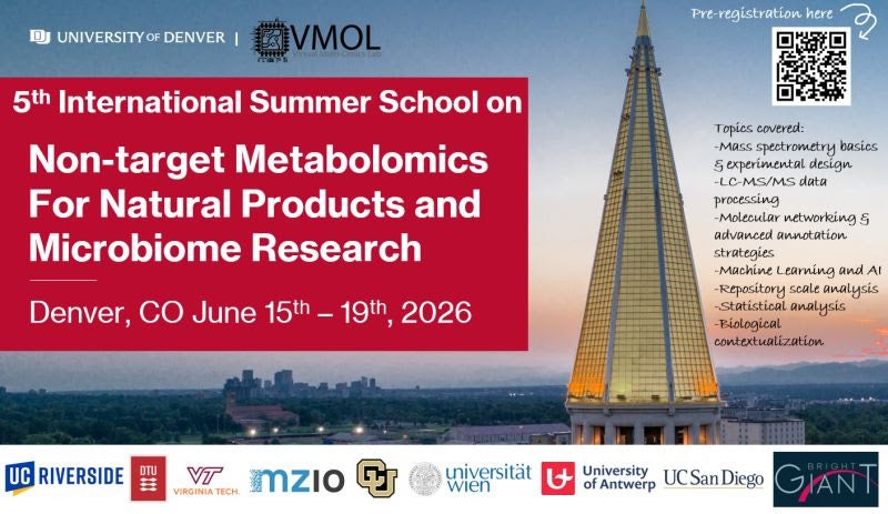 The 5th International Summer School on Non-target Metabolomics for Natural Products and Microbiome Research will be held at the University of Denver (DU) in Denver, CO this summer June 15-19, 2026. The event will host approximately 65 international students (both academic and industry) at the beautiful, mountain-adjacent DU campus. This summer school will focus on topics relevant to processing mass spectrometry-derived metabolomics data for natural products discovery and microbiome-focused research. Using a combination of lecture and interactive data processing break-out sessions, participants will learn topics mass spectrometry basics & experimental design, LC-MS/MS data processing, molecular networking & advanced annotation strategies, machine learning and AI, repository scale analysis, statistical analysis, and biology contextualization.