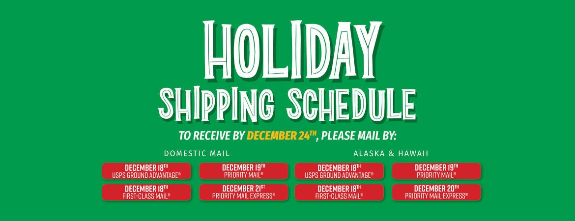 USPS Ground Advantage or First-Class Mail Service must be shipped by December 18.