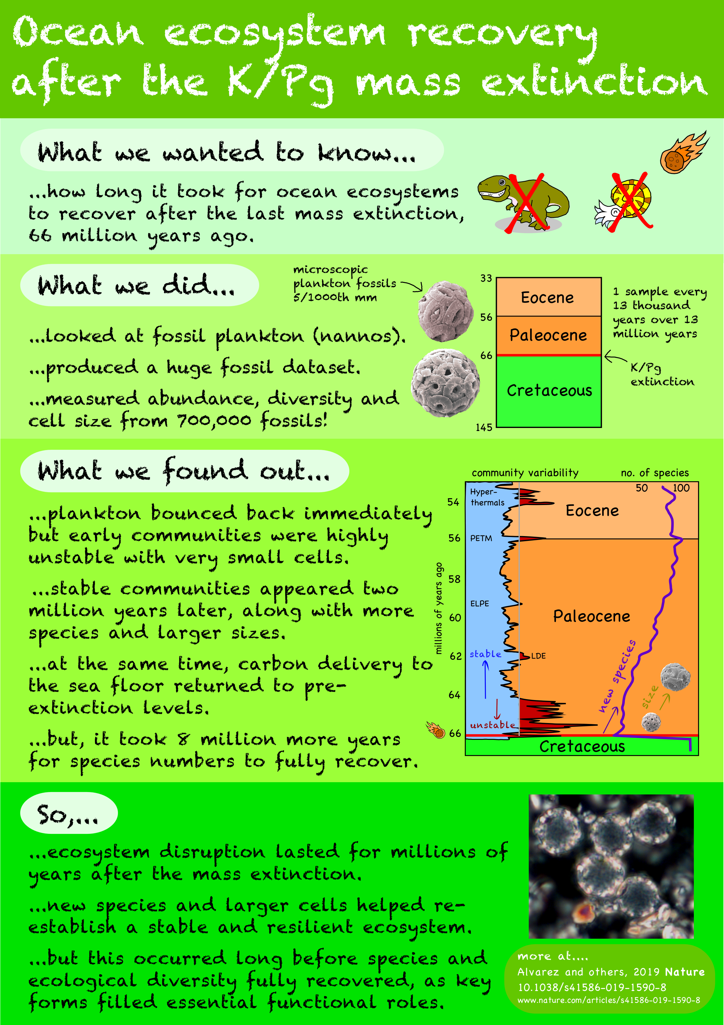The team produced an unprecedented record of the ocean’s recovery in the 13 million years that followed this event, measuring the abundance, diversity and cell size from over 700,000 fossils. Their findings are being published this week in Nature.