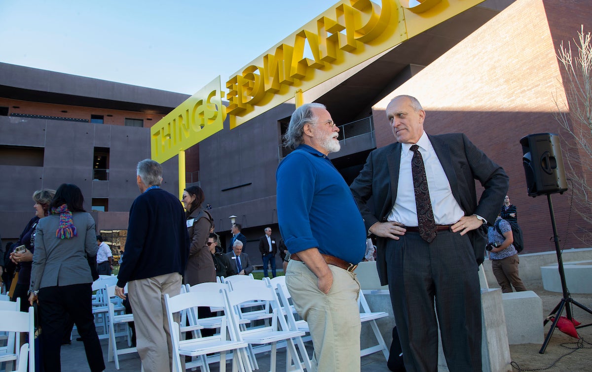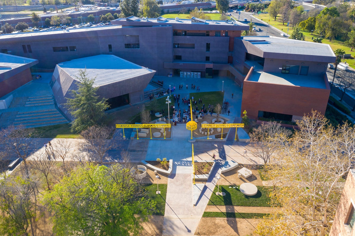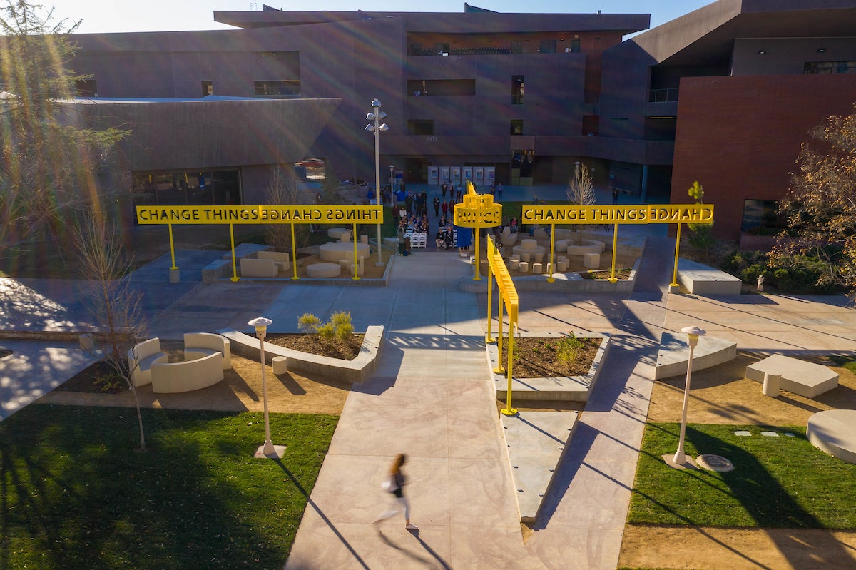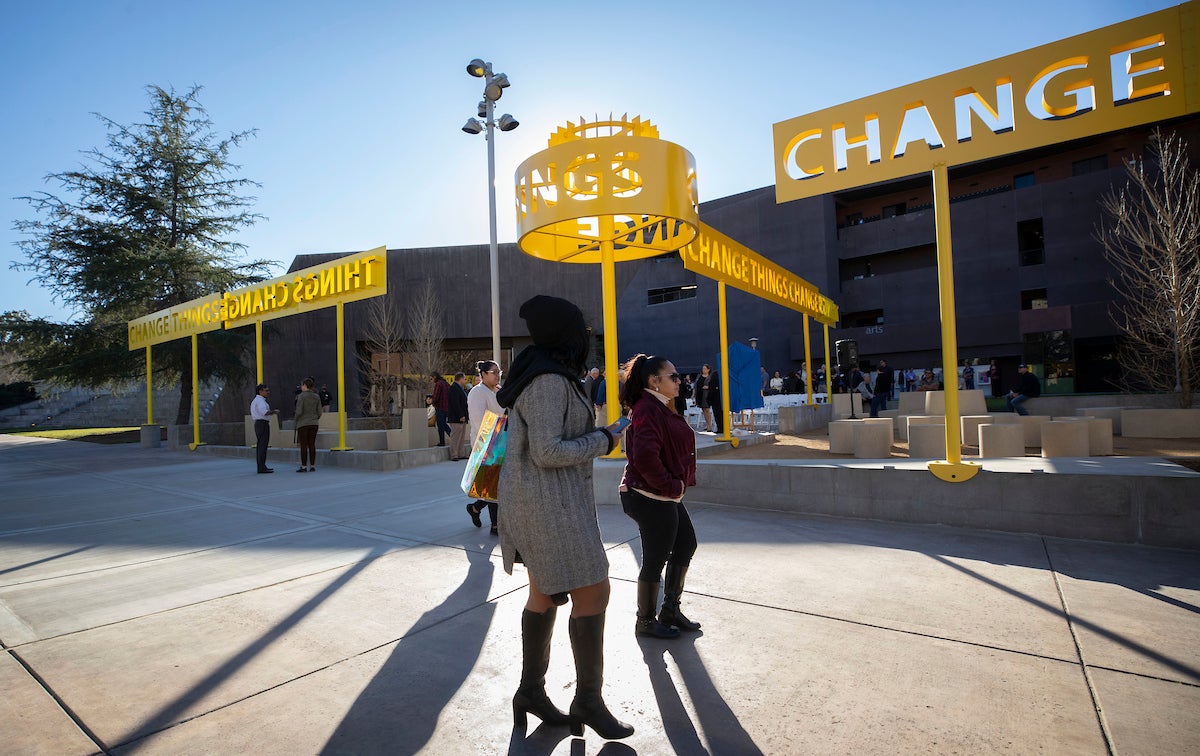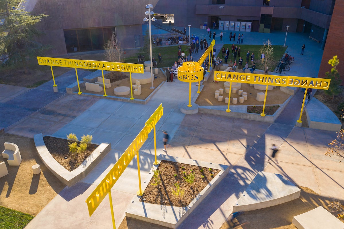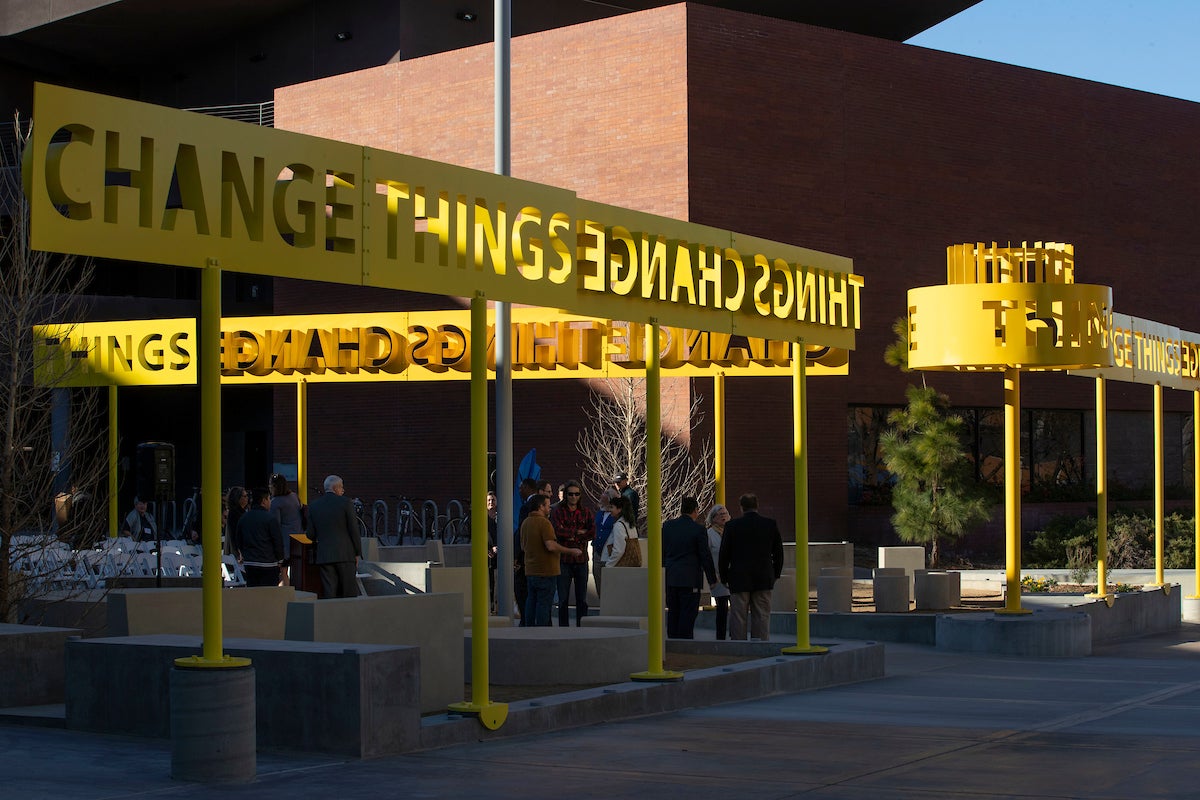 The campus celebrated the project completion Feb. 11 with a dedication ceremony in the middle of the bright yellow signs, concrete furniture, and garden landscape that make up the 5,000-square-foot circular sculpture outside the Arts building.