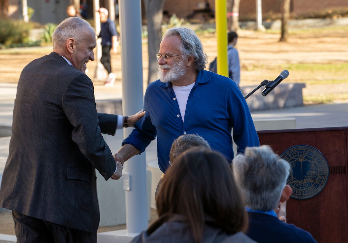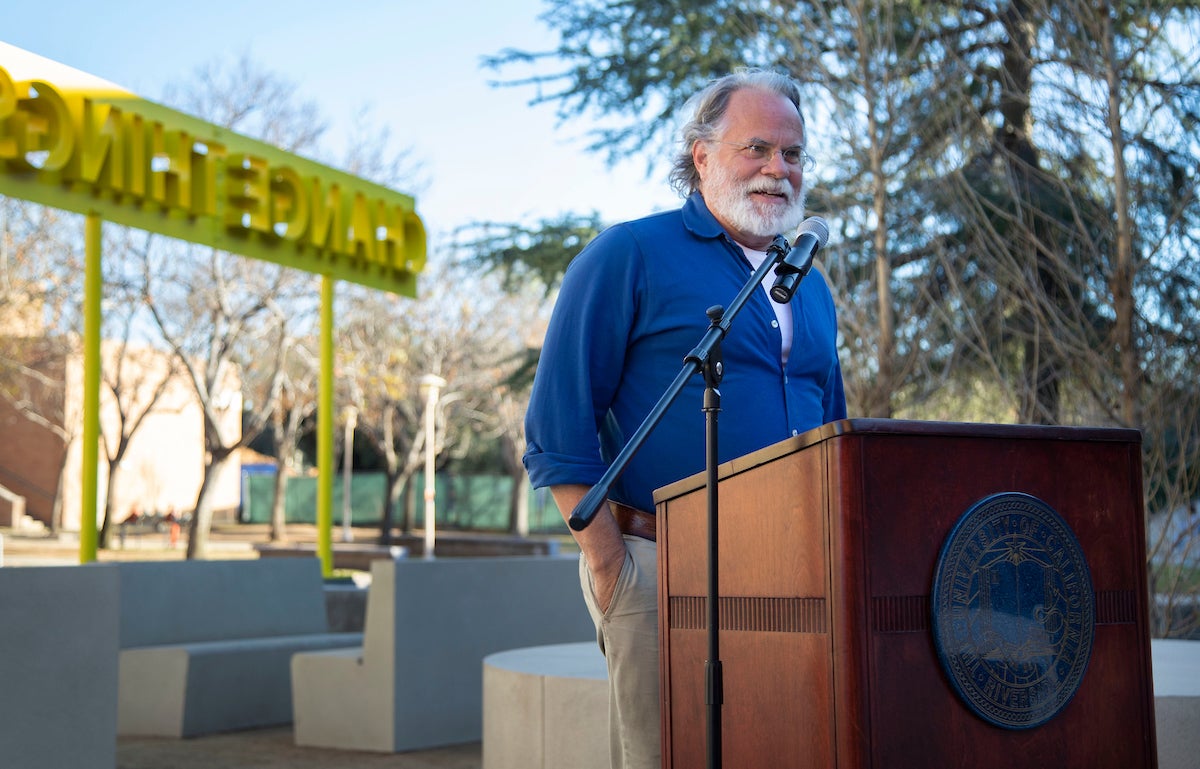 Jim Isermann, a UCR art professor who first proposed the project to the Advisory Committee on Campus Art, recounted the long journey to make the project a reality that began over a decade ago. The piece was initially shelved due to budgetary reasons but revived a few years ago.