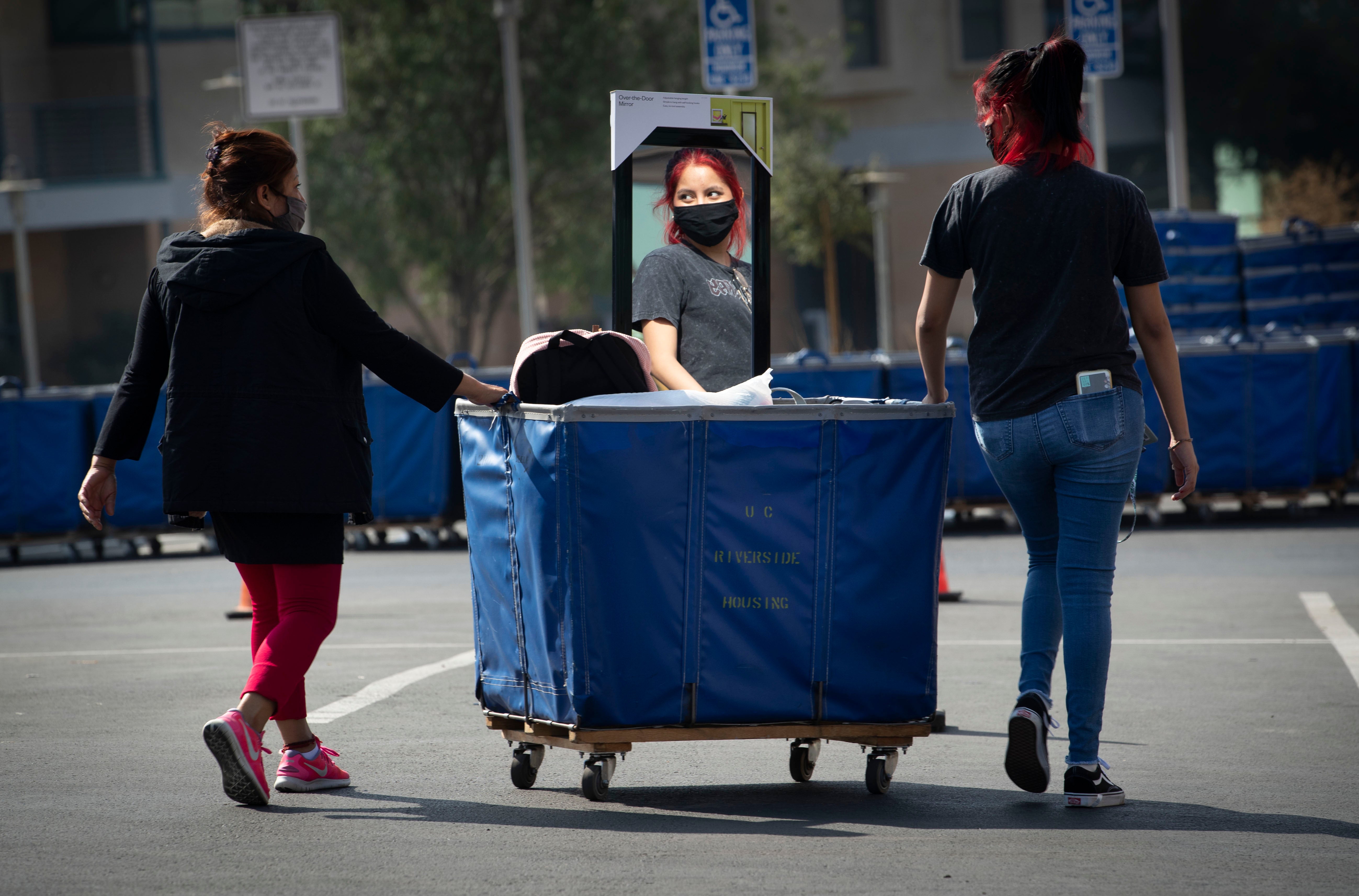 Parents hugged their children and said their goodbyes outside, as students wheeled their possessions in large blue carts into the residence halls. Family and friends were not allowed inside the buildings.