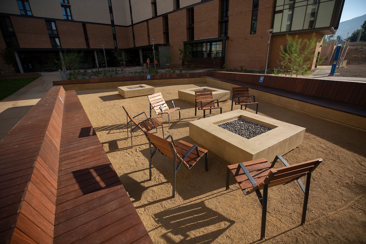The residence hall features several amenities including a fitness center, lounges, study areas, multipurpose room, and a laundry room. The two buildings wrap around a courtyard featuring Ping-Pong tables, rock gardens, newly planted trees, benches, and other outdoor seating.