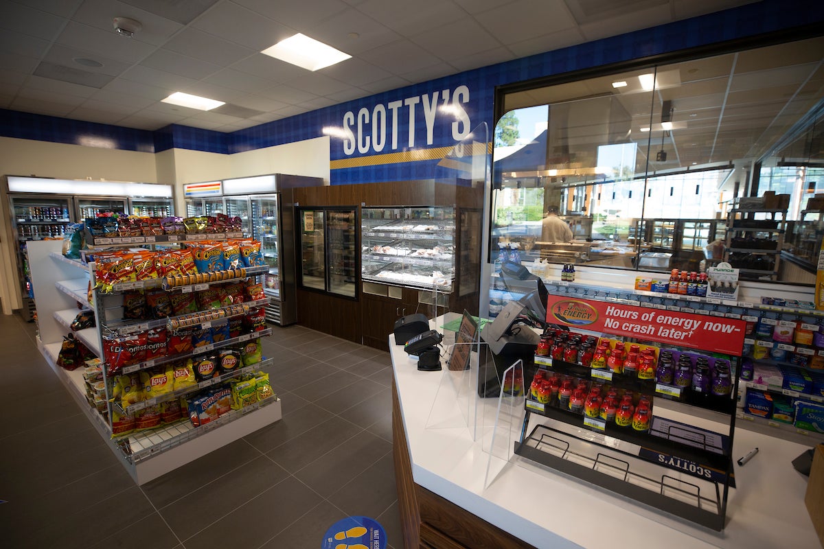 Glasgow has four food stations where students can order food, two private dining rooms, an exhibition bakery, outdoor terrace, and a Scotty’s retail store near the entrance.