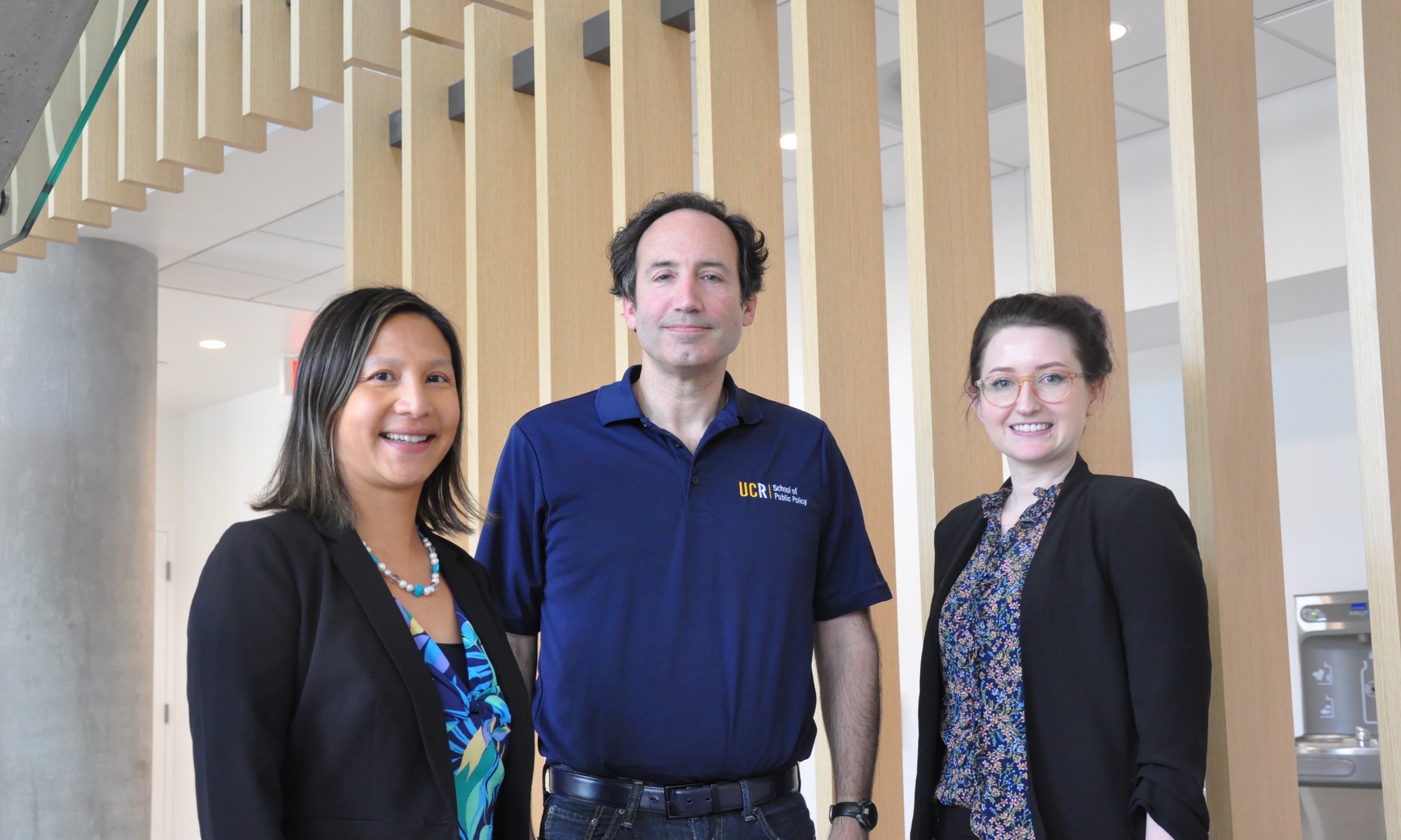 Header image: Photo shows, from left to right, Meera Nair, Richard Carpiano, and Erica Heinrich, who organized the community chat. (UCR/I. Pittalwala)