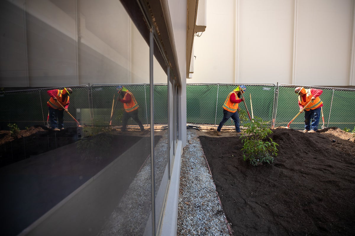 A landscape contractor began planting trees, bushes, and other vegetation this spring in a 20,000-square-foot area in the upper mall outside the Highlander Union Building, or HUB, next to Pierce Hall.