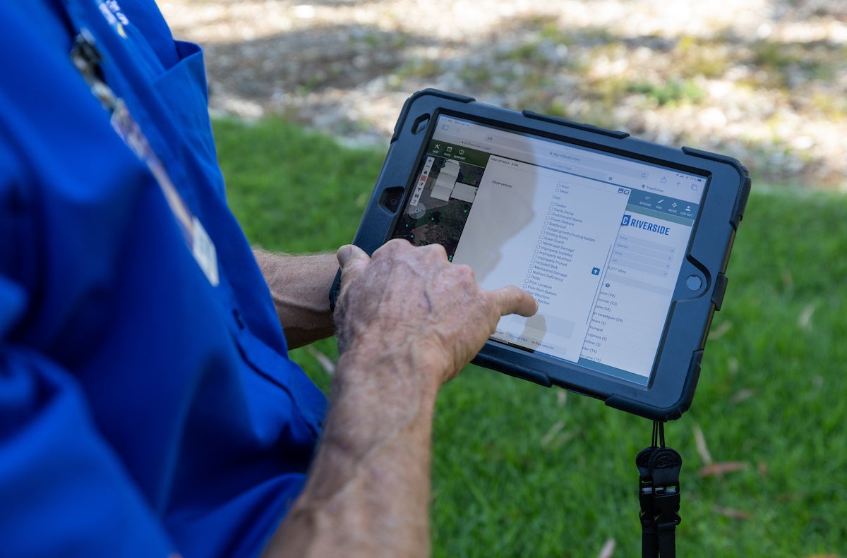 With a tablet in hand, landscape services employees can use GPS mapping to see each tree represented with a dot and click on each tree to see its health, species, and location.