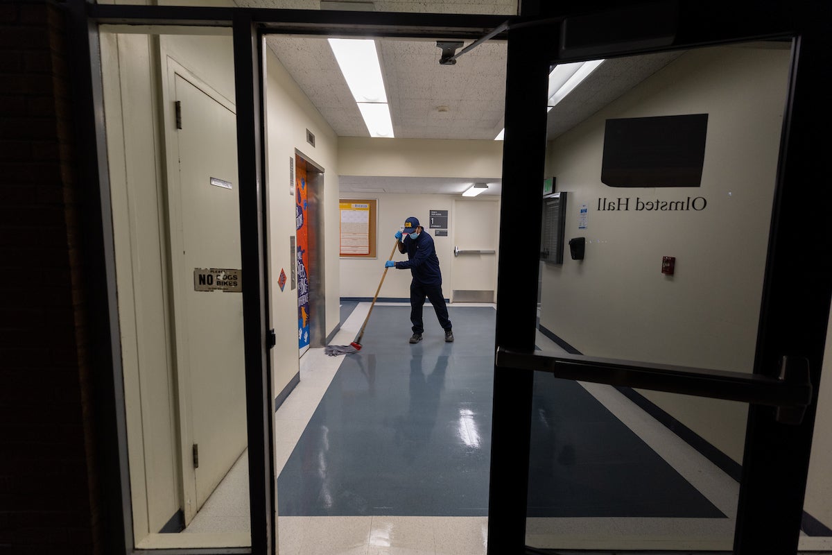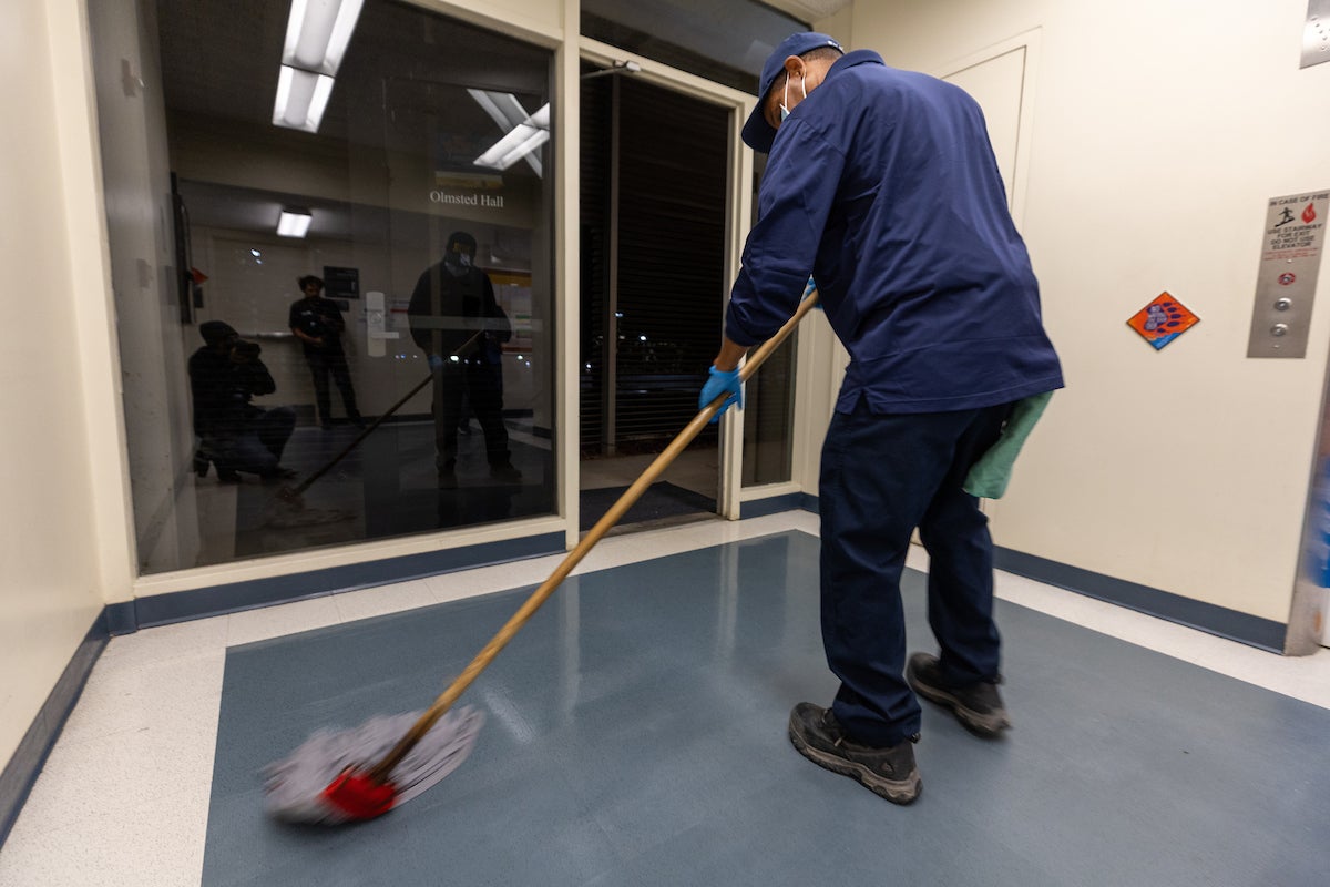 On a late October night, the crew was working in Olmsted Hall, cleaning the floors.