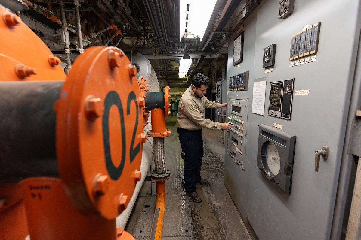 Plant operators Ricardo Rodriguez and Rudy Hernandez, who work the night shift, monitor readings from the plant control room. During their shift, they take readings, start up chillers, and remotely open valves.