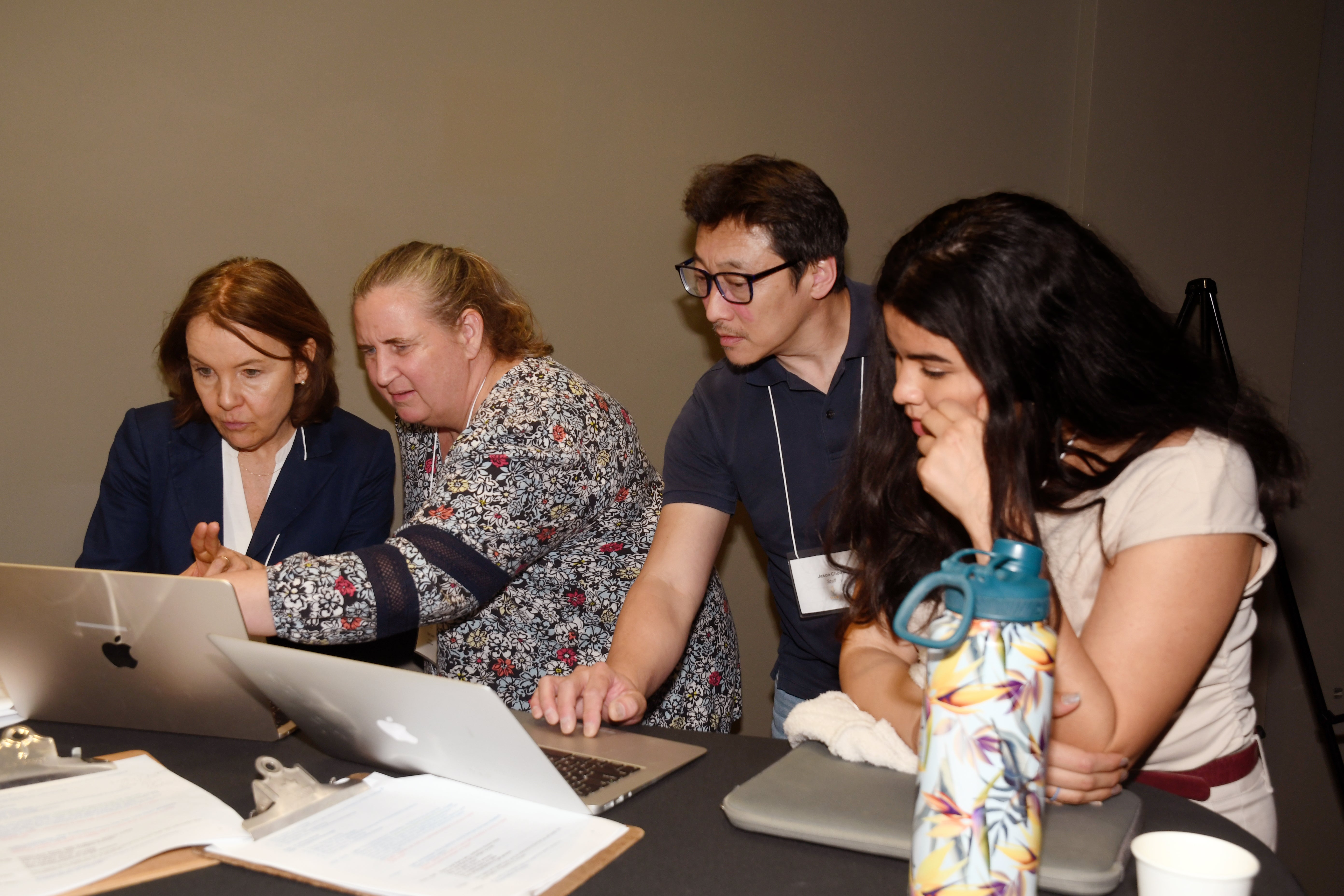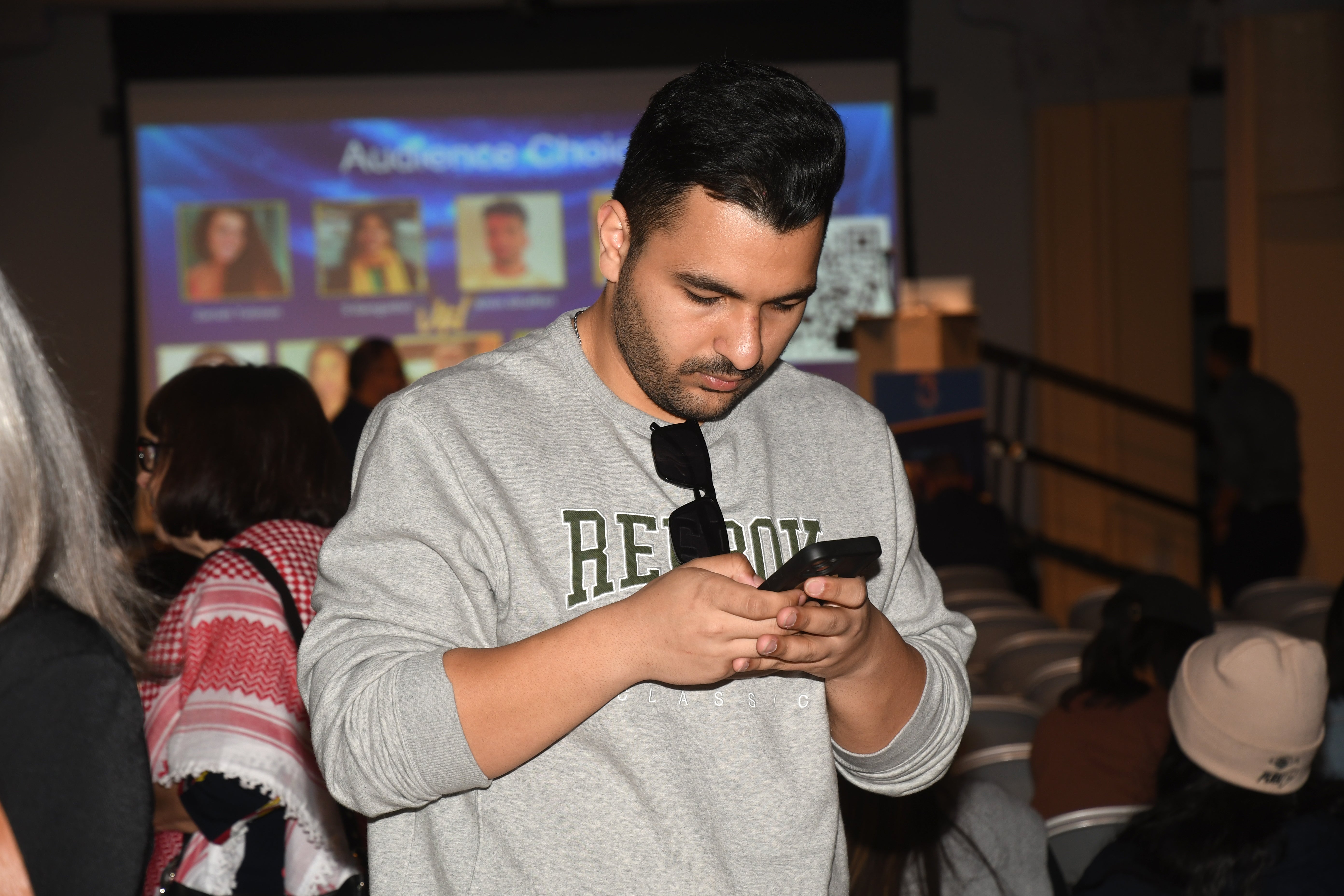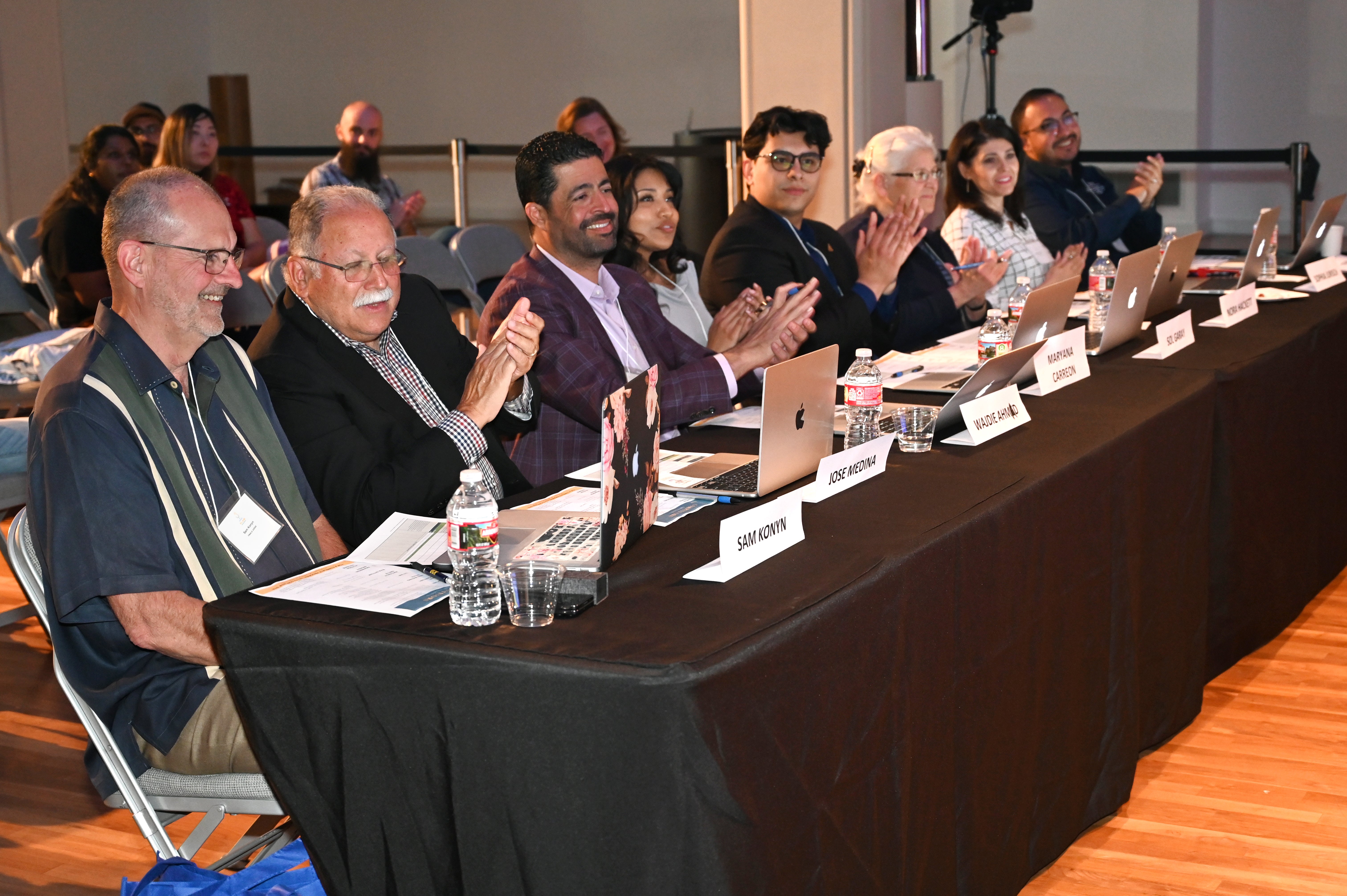 When the pitches were done, the last presenter’s slides were replaced with a QR code, and the audience was asked to vote for their favorite presenter. Then everyone was released for a 30-minute break while the judges’ scores were tallied. They were scored on how well they engaged the audience, how clearly they communicated key concepts, and how effectively they focused and presented their ideas.