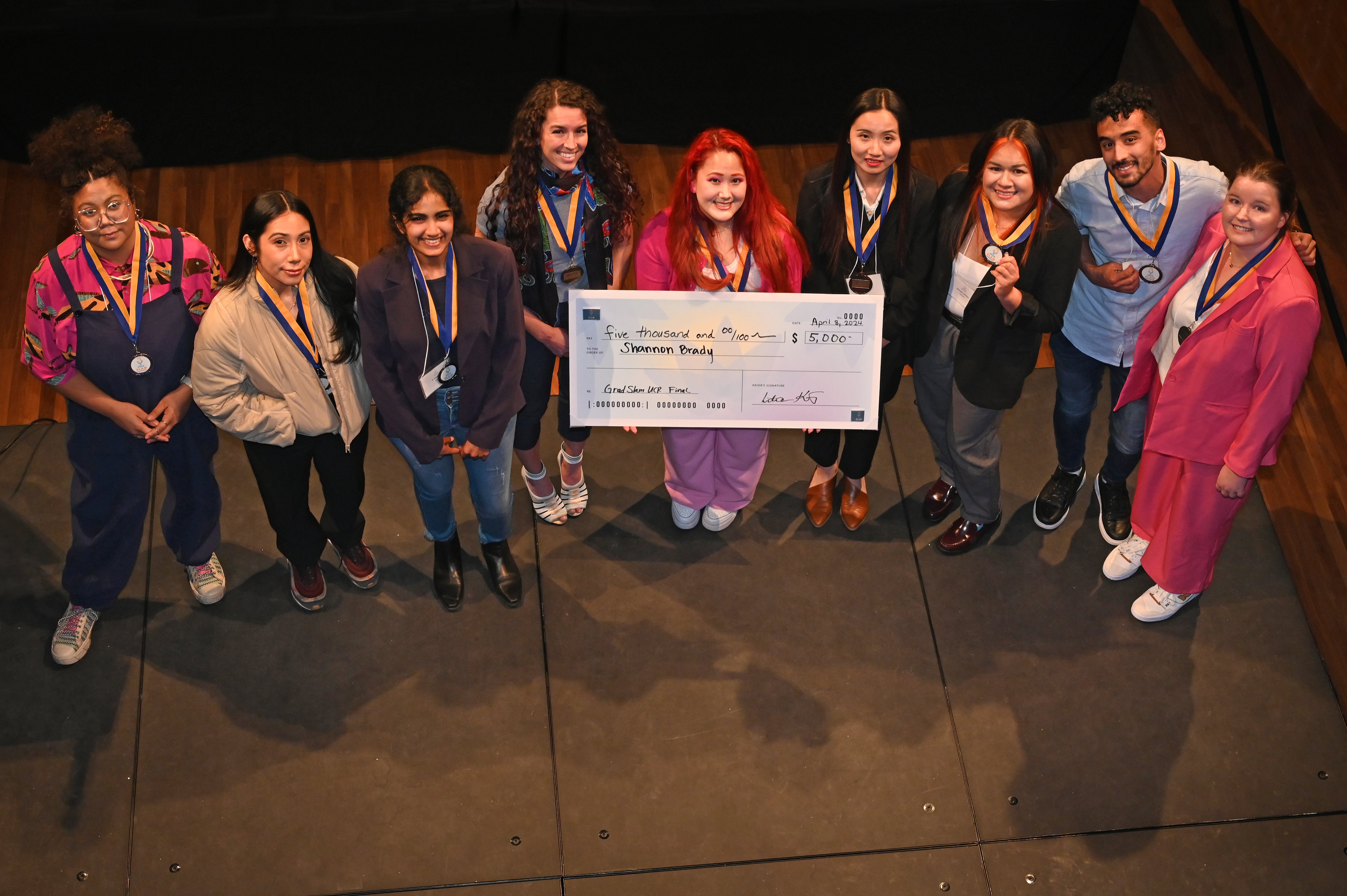 The grand prize winner was announced last — Shannon Brady (psychology) and her research, “Thinking out Loud: Is Self-talk a Secret to Success?” She was handed the giant check and reminded that she will have to do this all over again in a few weeks when she pitches in San Fransisco at the UCOP-hosted Grad Slam Finale. The finale brings together winners from the other nine UC campuses for one epic battle for $7,000.