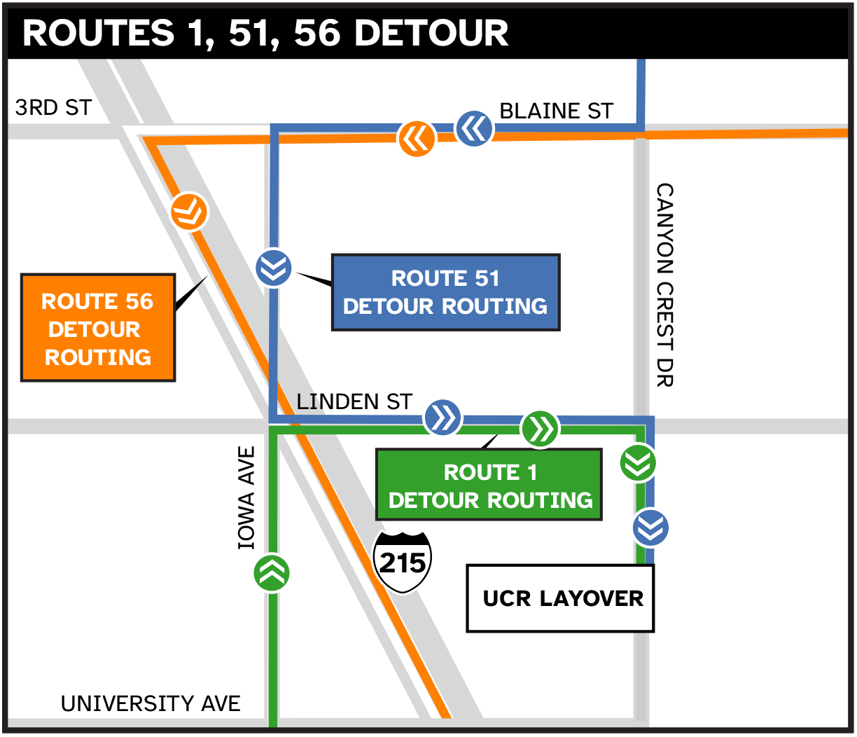 Starting Friday, May 2, routes 1 westbound, 16, and 204 resumed normal service. Routes 1 eastbound, 51, and 56 will continue to detour until road work near campus is completed.
