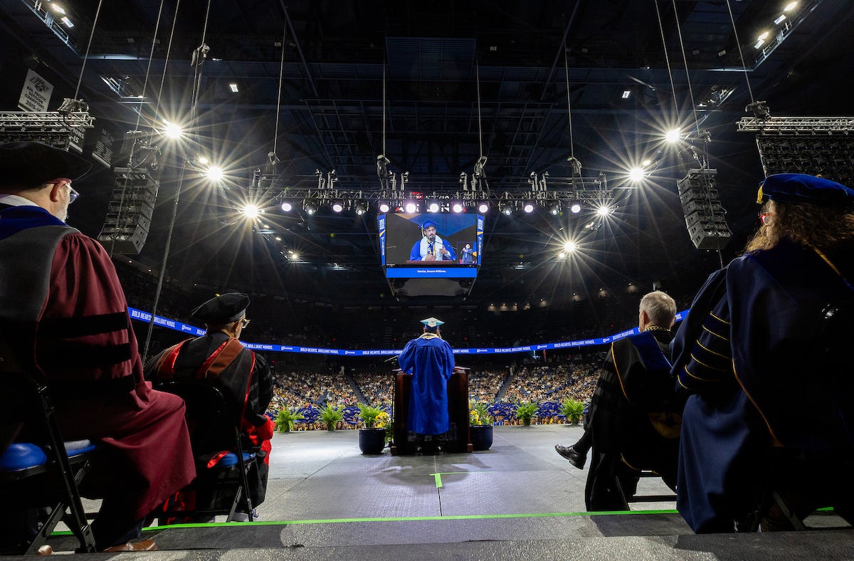- Graduate Division Hooding: Lidia Kos (vice provost and dean), Ivette Gabriella (psychology student speaker), and Aaron Bushong (University Honors director)