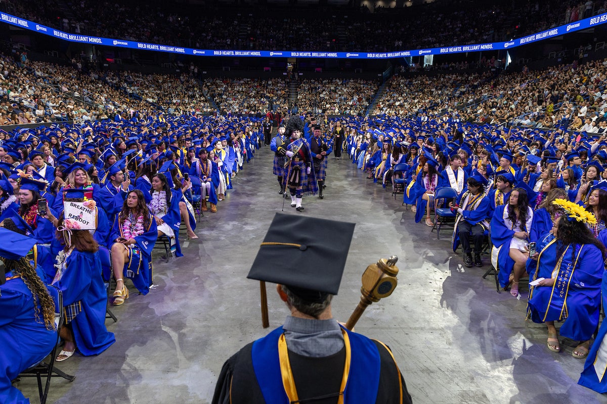 Ceremonies began with a video compilation of student experiences, a graduate procession to “Pomp and Circumstance,” a faculty and staff procession led by UCR’s Pipe Band, the Star-Spangled Banner, and a Native American land acknowledgment. Next were intros by deans, a welcome from Chancellor Kim Wilcox, words from elected student speakers, industry keynotes, the reading of graduate names, the singing of UCR’s Alma Mater, “Hail Fair UCR,” tassel turning, and, finally, a recession. Scotty the Bear also made appearances and mingled with the guests in the stands.