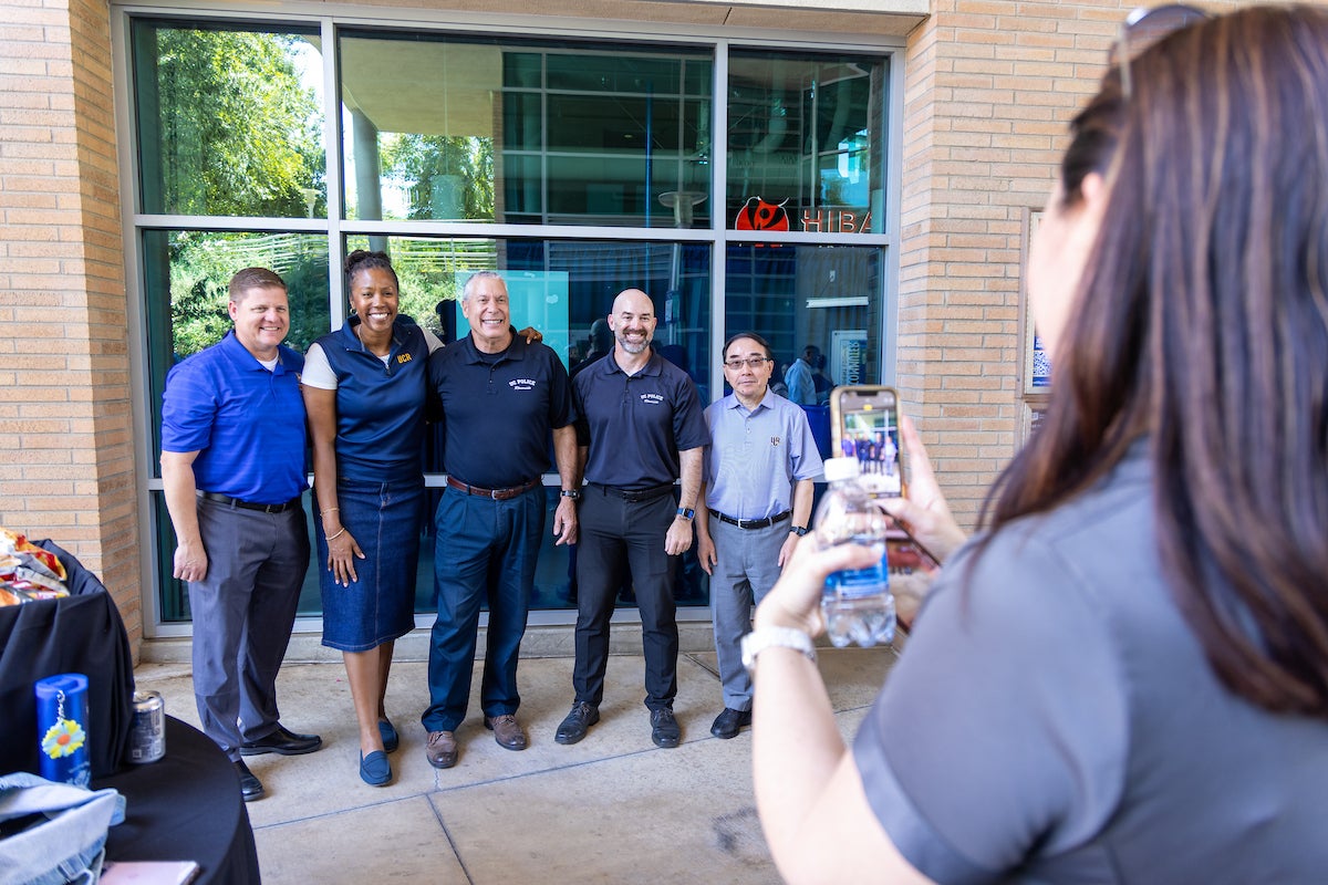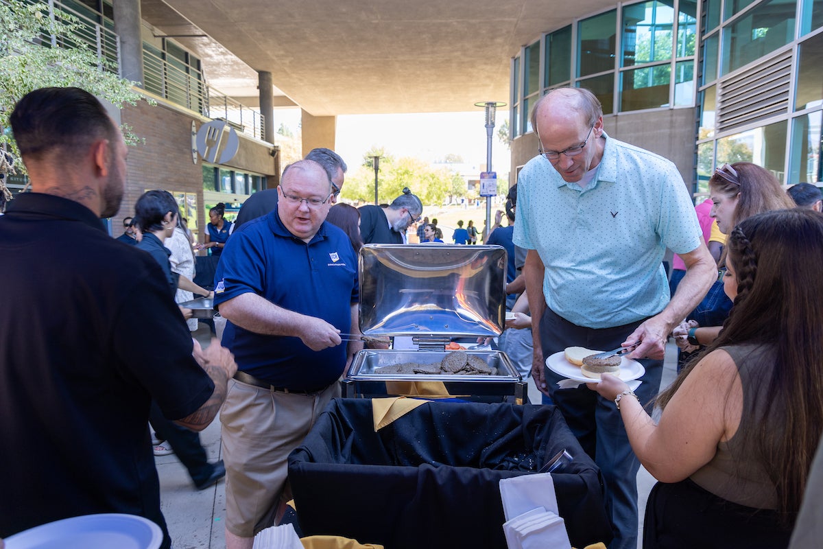 More than 1,000 employees joined the lunchtime gathering at the HUB Plaza where they dined on beef or vegan burgers, snacks, and drinks on a sunny day.