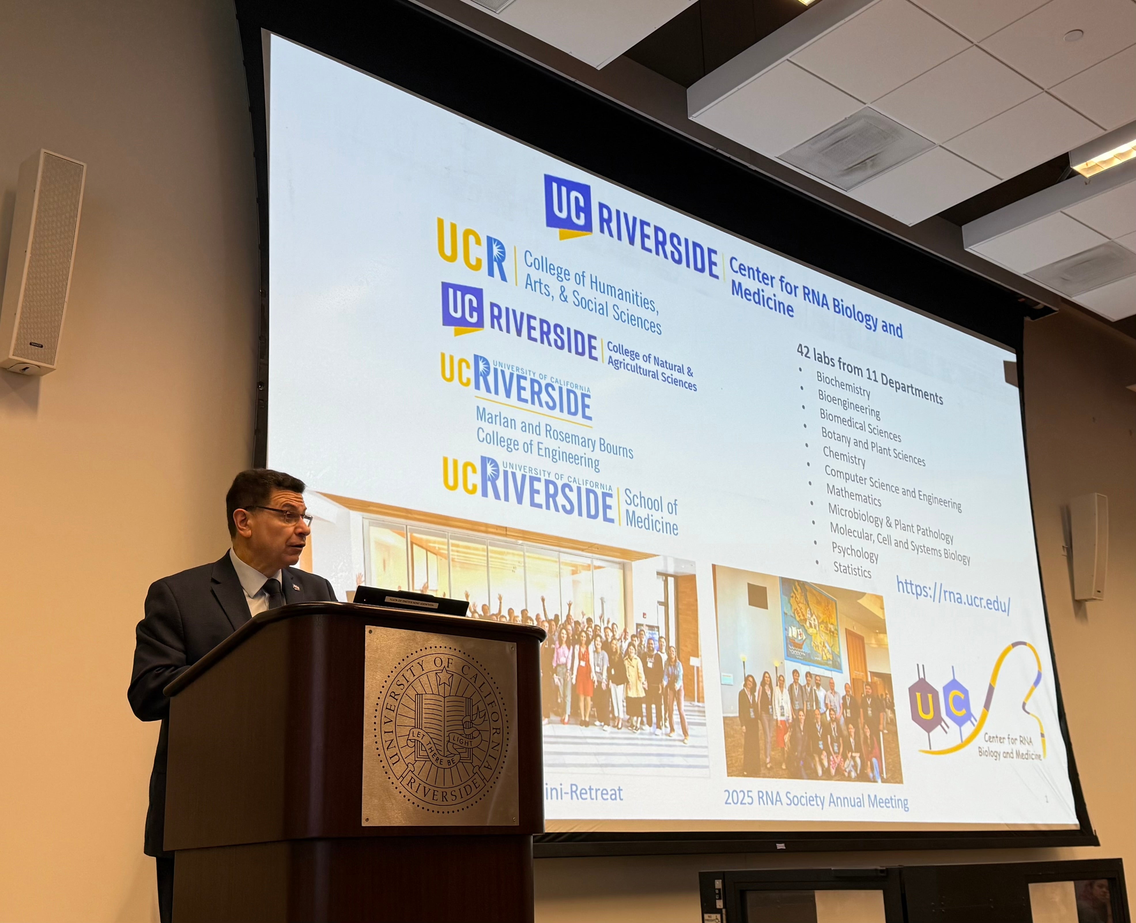The UCR Center for RNA Biology and Medicine, an interdisciplinary research center launched in 2022, combines the expertise of 42 laboratories from 11 departments and four colleges on campus. Earlier this month, the center hosted its third RNA Symposium, which featured a keynote address by Lynne Maquat, a Wolf Prize winner and professor of biochemistry and biophysics at the University of Rochester Medical Center, as well as RNA scientists from UC San Francisco, UC Berkeley, UCLA, UC Irvine, UC San Diego, and UCR.