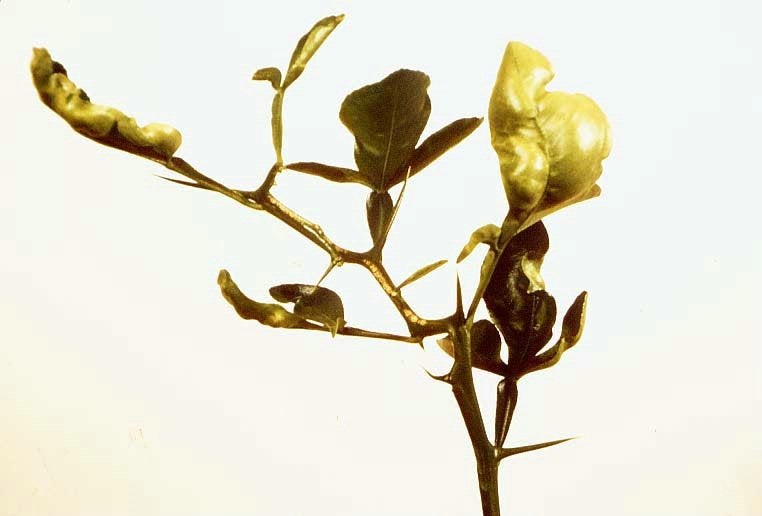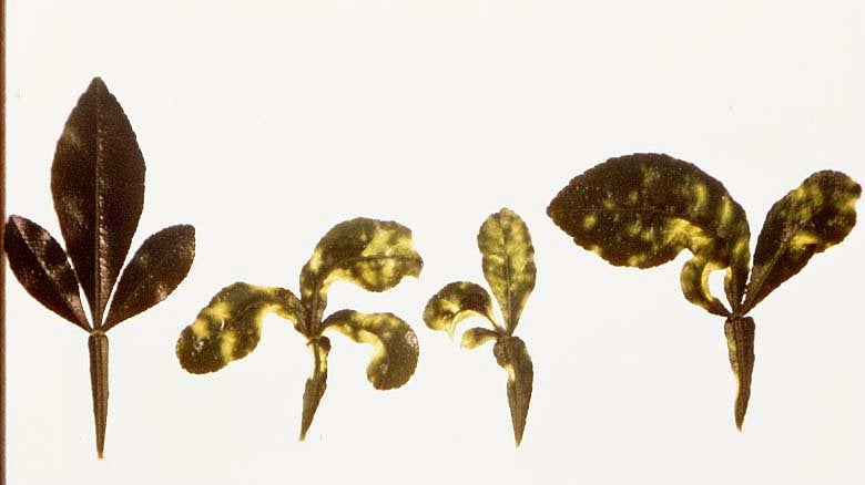 Leaves of CTLV-infected Citrus excelsa with irregularly indented margins and varying degrees of mottling. Some leaves remain small. Healthy leaf on the left. (California, USA) – J. M. Wallace