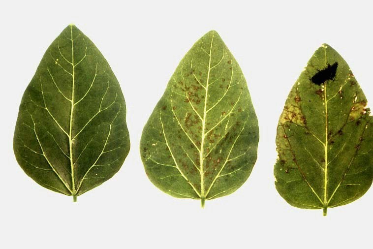 Healthy cowpea leaf (left) and two leaves with reddish necrotic local lesions as a result of mechanical inoculation with CTLV. (California, USA) – L. G. Weathers