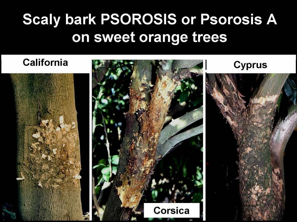 Bark lesions of psorosis A on trunk and branches of sweet orange trees in California (L. J. Klotz), Corsica (R. Vogel) and Cyprus (J. M. Bové).