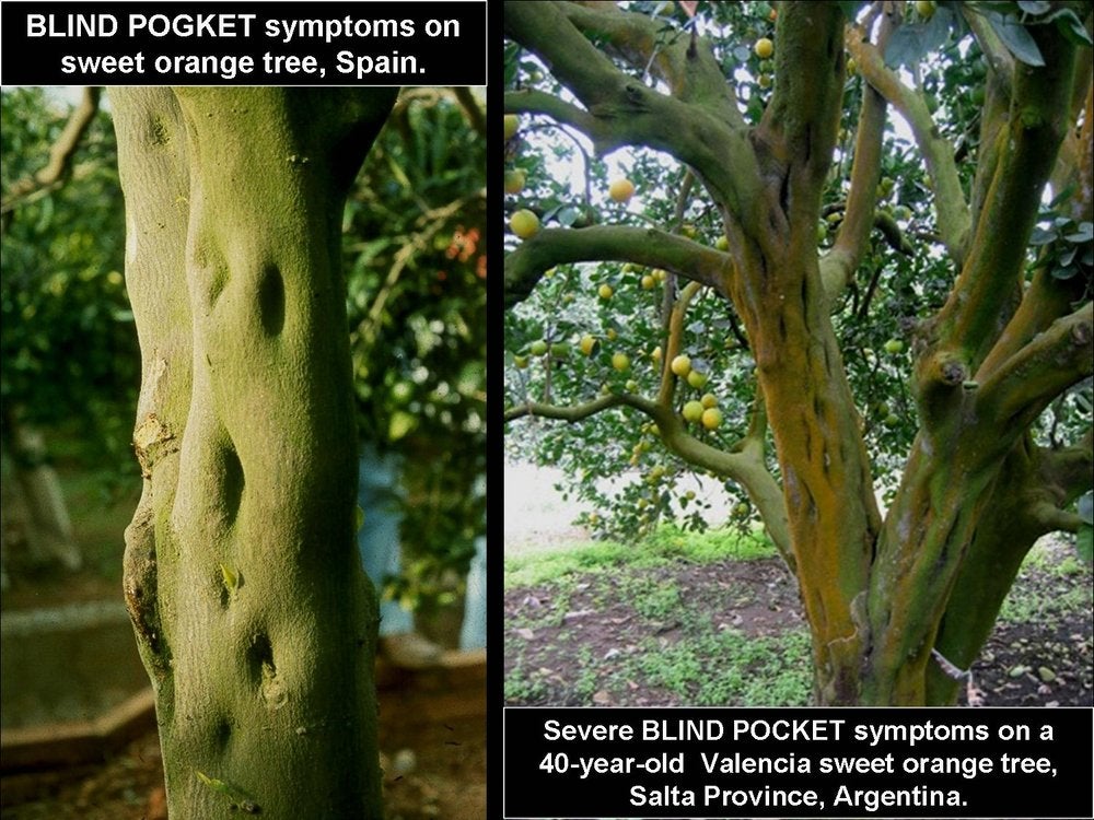 Severe symptoms of blind pocket on sweet orange trees in Spain (C. N. Roistacher) and Argentina, Salta province (Julia Figueroa).