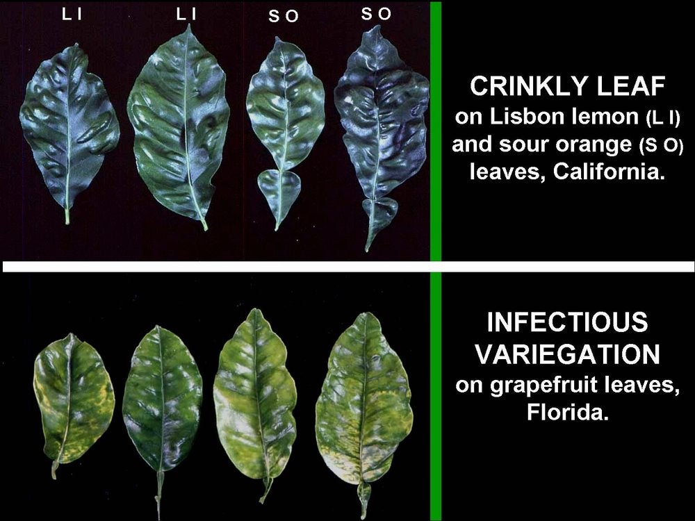 Upper half: symptoms of crinkly leaf on two Lisbon lemon and two sour orange leaves, California ( P. R. Desjardins). Lower half: symptoms of infectious variegation on Marsh grapefruit leaves, Florida (S. M. Garnsey).
