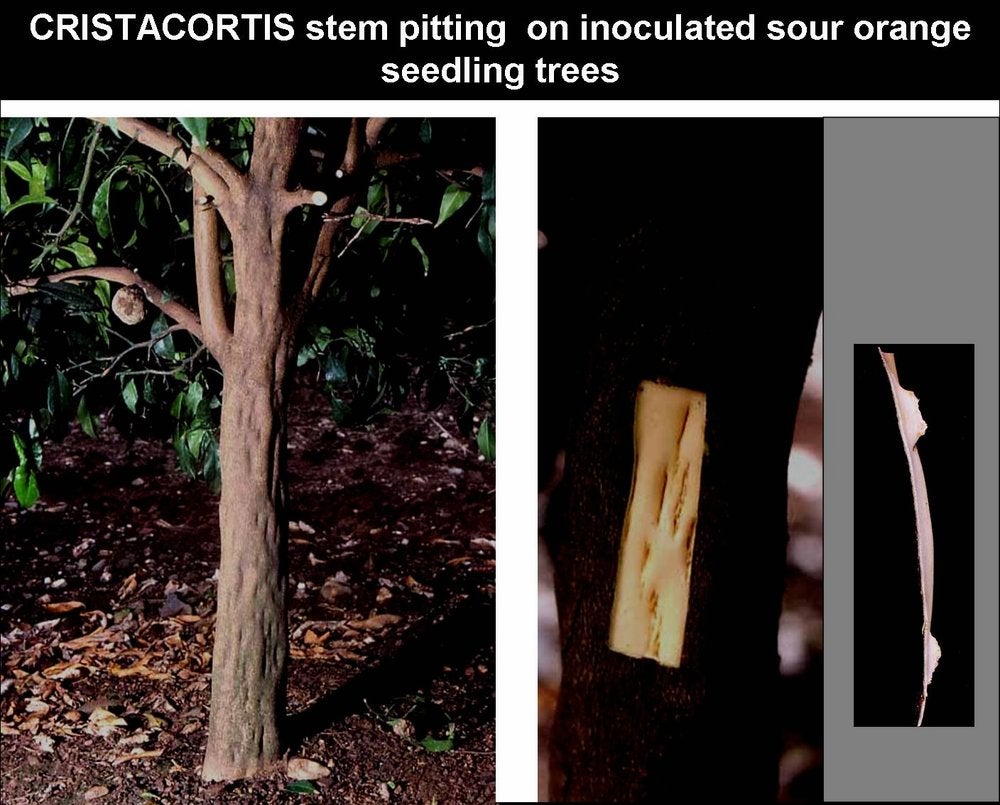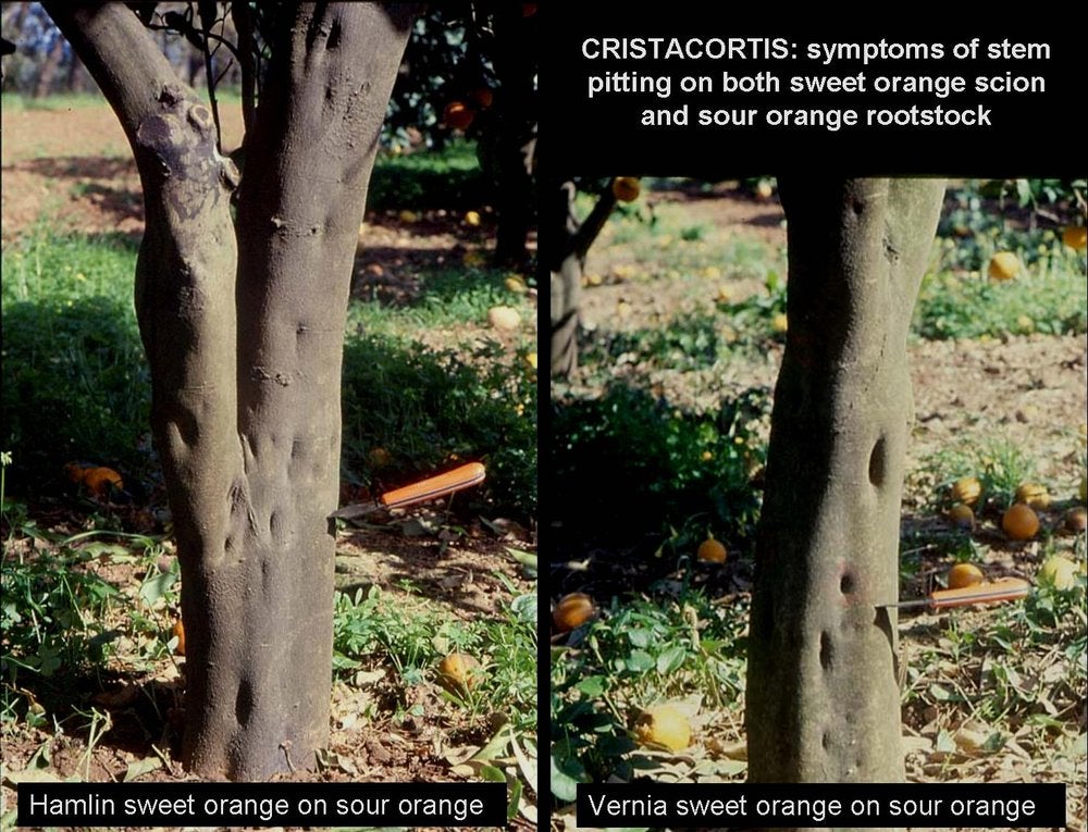 Stem pitting symptoms of cristacortis are frequently seen on sour orange rootstocks (CG-BP. 12, 25); symptoms of CG-BP are never seen on sour orange rootstocks (CG-BP. 03, 11, 13, 16).