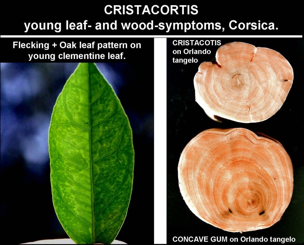 Vogel and Bové (1964, 1968, 1972), when studying cristacortis (CG-BP. 07), always observed psorosis young-leaf symptoms, not only flecking but also oak-leaf patterns (CG-BP. 08), on citrus plants infected either naturally or experimentally (by graft-inoculation) with the cristacortis pathogen. As oak-leaf patterns were thought to be characteristic of concave gum, and since many cristacortis sources showed or induced such leaf symptoms in inoculated navel sweet orange or Orlando tangelo seedlings, it was concluded, initially, that the young-leaf symptoms were caused by the concave gum agent, co-infecting the cristacortis sources (Vogel and Bové, 1972). However, sources of cristacortis free of concave gum could be identified on the basis of internal wood symptoms (Vogel and Bové, 1974). Indeed, the Concave gum agent induces gum deposits in certain annual growth rings in the wood. As the growth rings are concentric, the gum-stained layers have also a concentric appearance (CG-BP. 08). On the contrary, cristacortis induces radially oriented stem pits (CG-BP. 08). Furthermore, traces of previous, radially oriented pits remain buried in the wood (CG-BP. 29). Sources carrying both concave gum and cristacortis induce the concentric gum-stained layers as well as the radially oriented traces. On the basis of these criteria, sources of cristacortis free of the concave gum agent were identified, and these sources showed and induced young-leaf symptoms including oak-leaf patterns on inoculated citrus seedlings. These results showed that concave gum and cristacortis were different diseases, but both were associated with the same young-leaf symptoms (CG-BP. 06) (Vogel and Bové, 1974).
