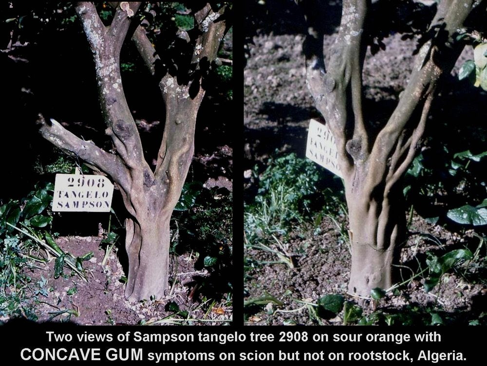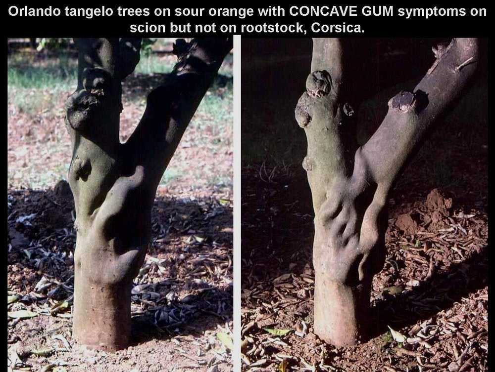 Two Orlando tangelo trees on sour orange with severe concave gum symptoms on scions but no symptoms on tolerant sour orange rootstocks. (Corsica) – J. M. Bové