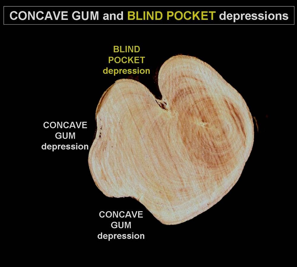Often concave gum and blind pocket depressions occur together on the same tree (CG-BP. 11, 12, 18)