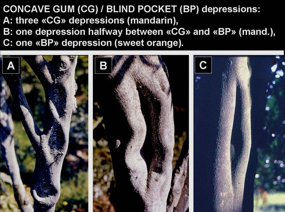 Broad concave depressions, narrow pocket-like depressions, intermediate depressions on trunk, main limbs, and branches (CG-BP. 19, 20). With tolerant rootstocks such as sour orange in many Mediterranean countries, depressions and distortions will only affect the scion trunk, not the sour orange rootstock. Photos CG-BP. 03, 04, 10, 11, 12, 13 show trunks highly characteristic of concave gum-blind pocket.