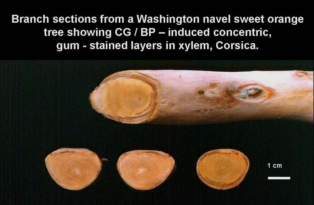 Wood symptoms. On inoculated seedlings of Washington navel sweet orange and Orlando tangelo, CG-BP depressions (CG-BP. 38) develop earlier than on other citrus species, and characteristic wood symptoms of CG-BP [concentric gum-stained growth layers in the xylem (CG-BP. 21)and gum oozing (CG-BP. 14)] often develop within two to three years, even before CG-BP depressions on the trunk and branches can be seen. The gum-stained layers frequently appear in shoots with very small diameters. On Orlando tangelo seedlings, the typical CG-BP depressions develop within six years, while cristacortis stem pitting is obtained within 3 years (Vogel and Bové, 1974).