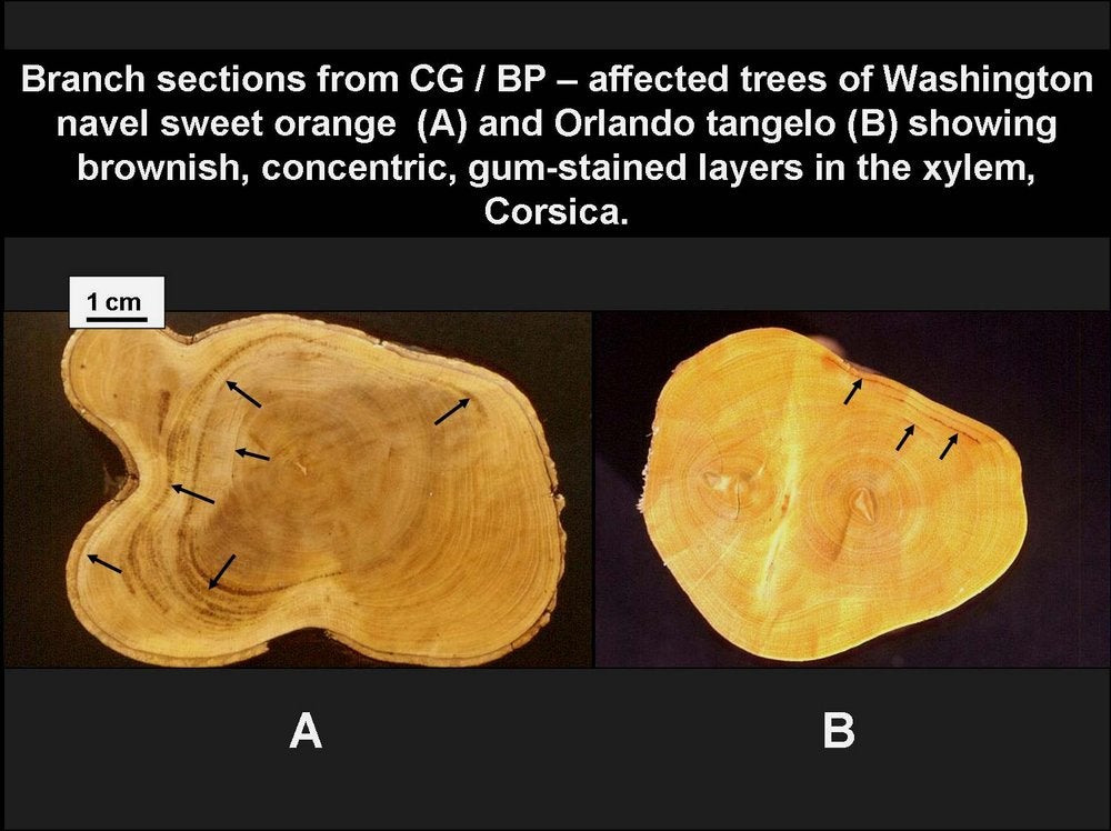 Brownish, concentric, gum-stained wood layers, characteristic of concave gum-blind pocket, on section from a Washington navel sweet orange limb (A) and a Orlando tangelo branch (B). (Corsica) – R. Vogel