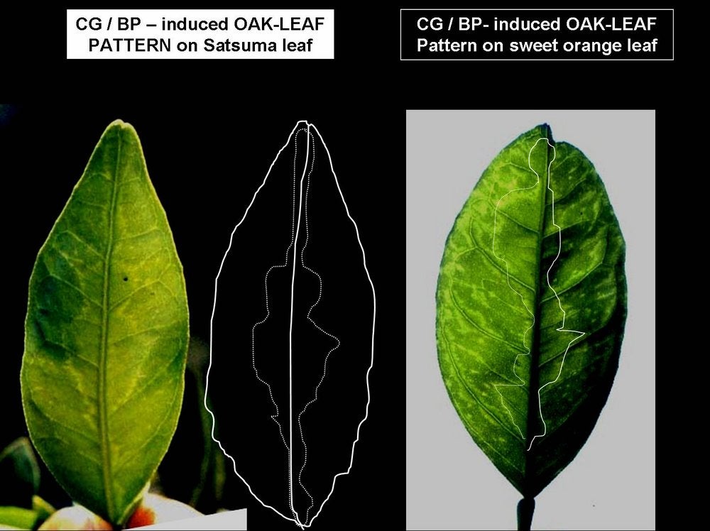 Young leaf symptoms of Psorosis-A are only of the “flecking” type. Young leaf symptoms of CG-BP, but also of cristacortis and impietratura, are of two types: flecking and the characteristic oak-leaf pattern (CG-BP. 06). However, the first symptoms to appear on the young emerging flush of seedlings of sweet orange, mandarin, or Dweet tangor, within 5 to 8 weeks after inoculation, is interveinal flecking (CG-BP. 39), and oak leaf patterns are usually not yet seen in this initial symptom. In the absence of branch or fruit symptoms, presence of oak-leaf pattern indicates infection with CG-BP, cristacortis or impietratura.