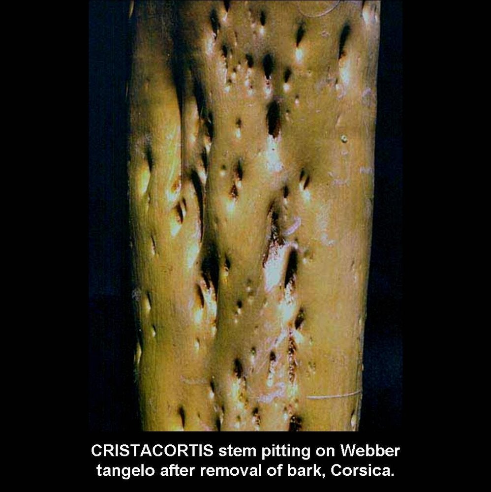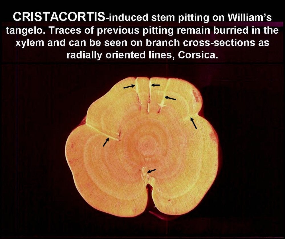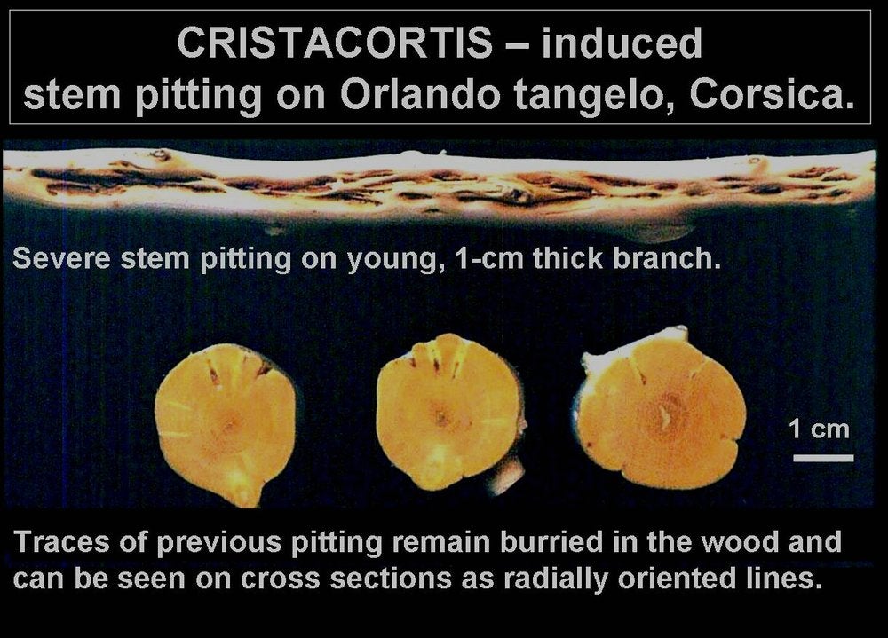 On Orlando tangelo seedlings graft-inoculated with the cristacortis agent, severe stem pitting may develop on very young branches, only ~1cm in diameter, and the radially oriented traces of old pits can be seen on cross sections of branches only a few centimetres in diameter. (Corsica) – R. Vogel