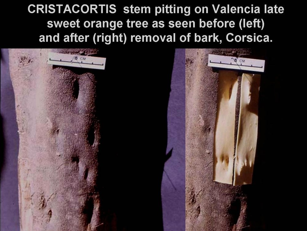 Vogel R., J. M. Bové. (1968). Cristacortis, a virus disease inducing stem pitting on sour orange and other citrus species. p. 221228. In J. F. L. Childs (ed.) Proc.4th Conf. Intern. Organization Citrus Virol., Univ. Florida Press, Gainesville.