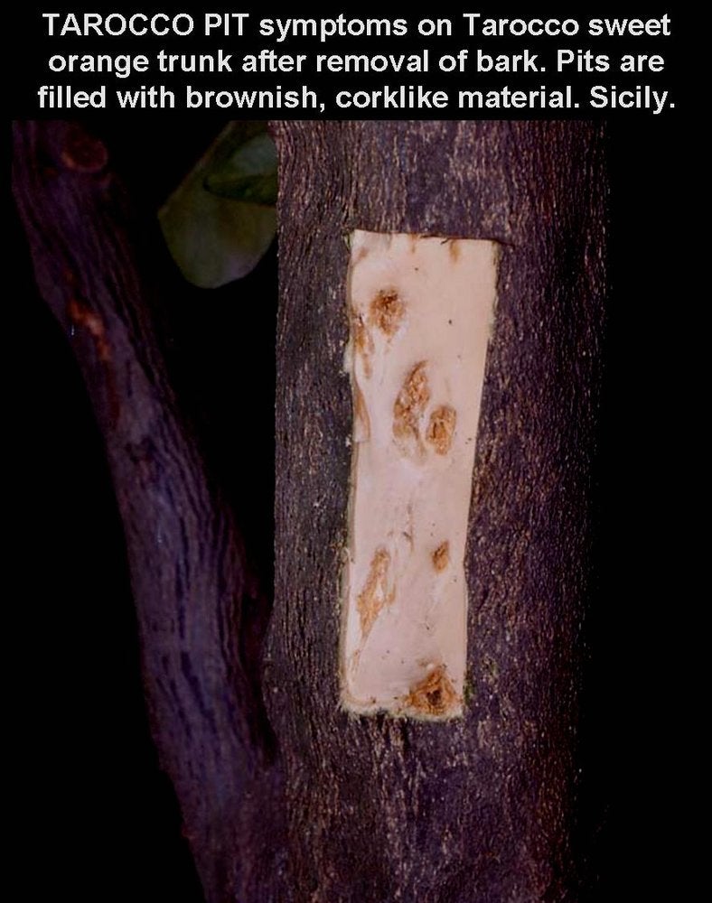 Deep pits associated with corresponding pegs on the cambial side of bark were observed on Rubidoux trifoliate orange rootstock infected with citrus bent leaf viroid (CBLVd) variant-1a (Roistacher et al, 1993). Similar symptoms were also seen in Corsica on Pomeroy trifoliate orange rootstocks in an extensive viroid assay involving various variants of CEVd, HSVd, CDVd, CBCVd, and variant 1a and 1b of CBLVd (Vernière et al., 2004). However, these symptoms were not the result of viroid infections as they were present in trees of all treatments, including the non-inoculated controls. Furthermore, the pits resemble more cristacortis pits than CG-BP depressions, since they have corresponding pegs on the cambial side of the bark.