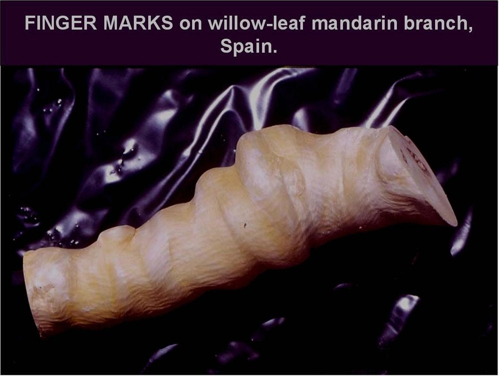 Willow leaf mandarin branch showing “finger marks”. Such marks are probably not transmissible by graft-inoculation. (Spain) – J. Gil-Fibla