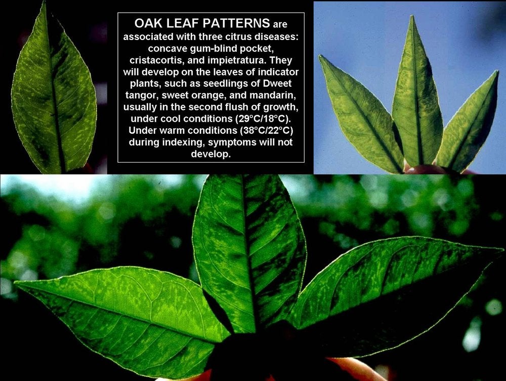 Oak-leaf patterns on leaves of indicator plants of Dweet tangor, sweet orange or mandarin are diagnostic for concave gum-blind pocket, cristacortis or impietratura. (California) – C. N. Roistacher