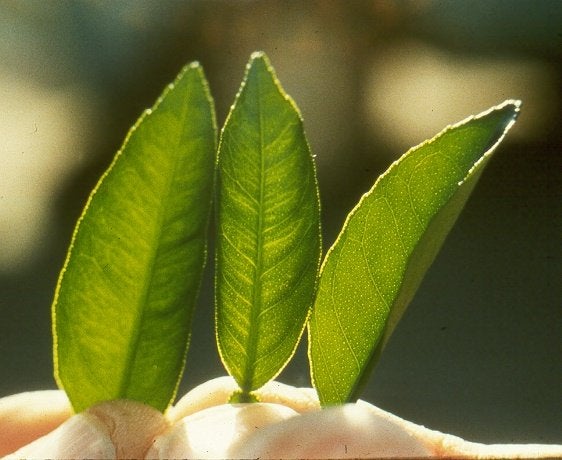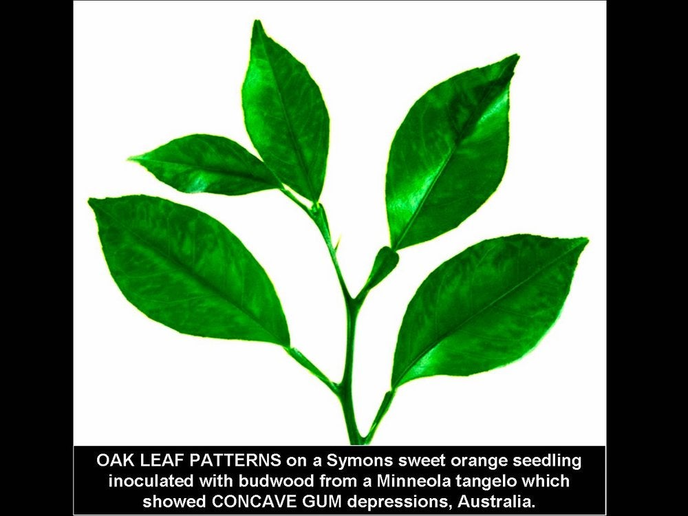 Oak- leaf patterns on leaves of a Symons sweet orange seedling graft-inoculated with budwood from a Minneola tangelo, which showed characteristic concavities of concave gum. (Australia) – Patricia Barkley